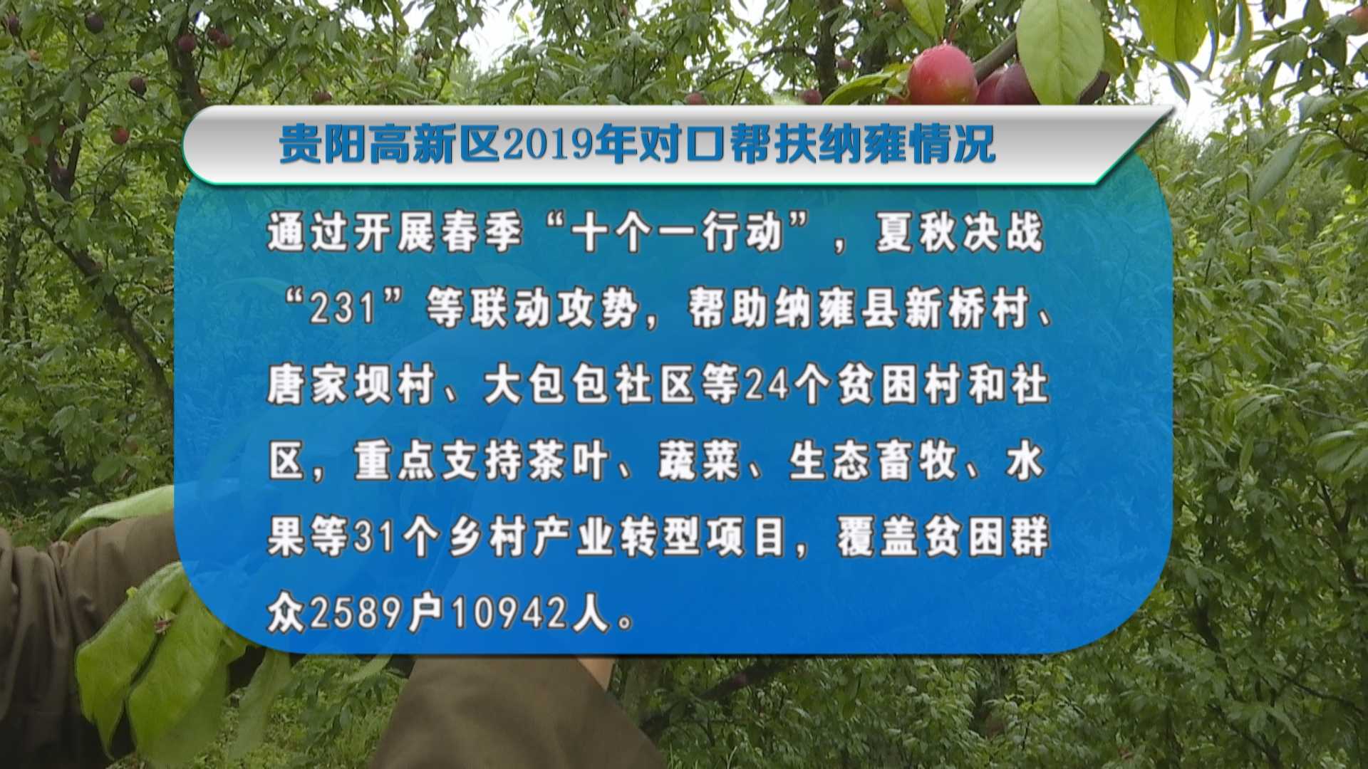 2019年,贵阳高新区通过开展春季“十个一行动”、夏秋决战“231”等联动攻势,帮助纳雍县新桥村、唐家坝村、大包包社区等24个贫困村和社区,重点支持茶叶、蔬菜、生态畜牧、水果等31个乡村产业转型项目,覆盖贫困群众2589户10942人。