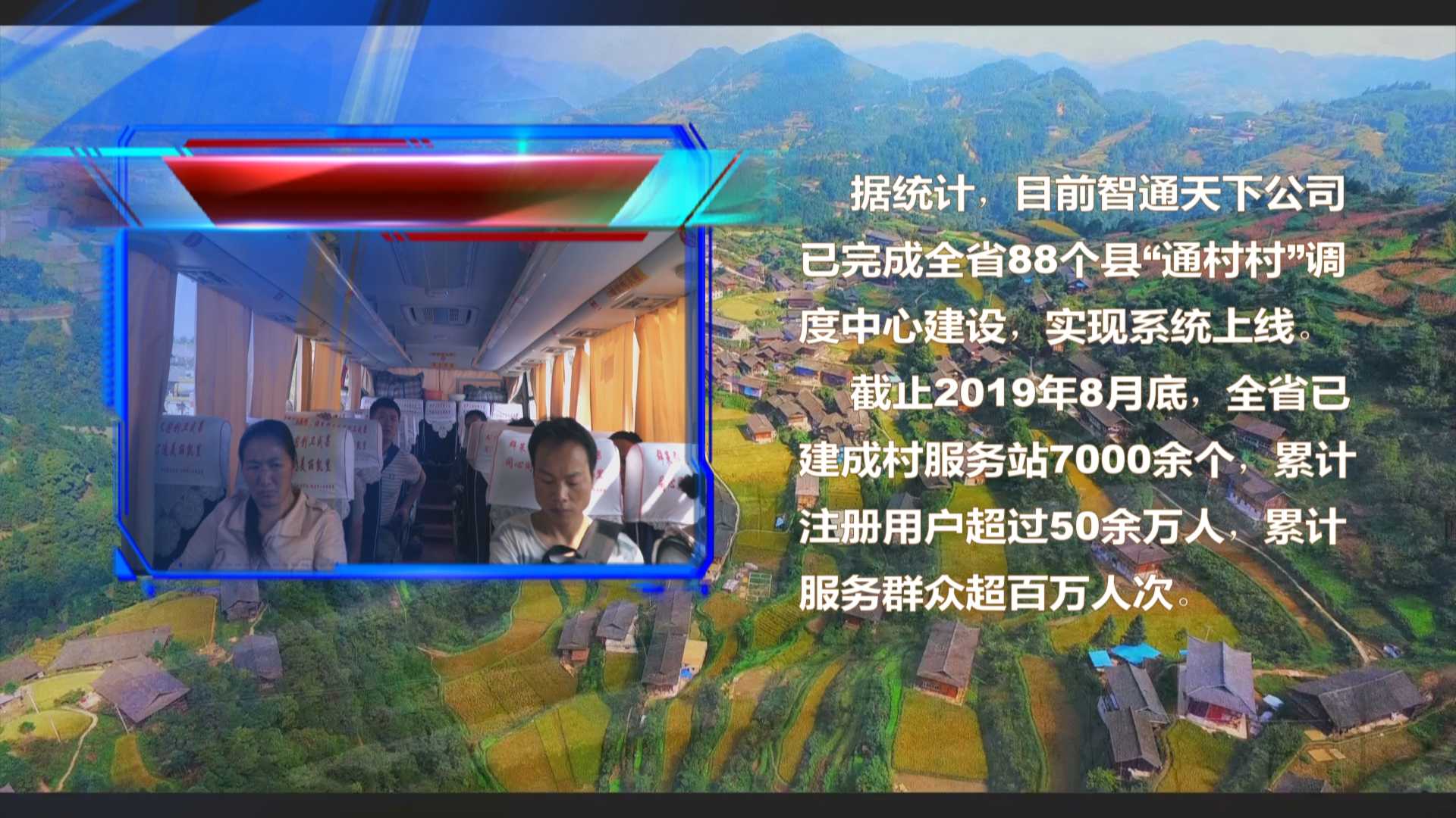 据统计,目前智通天下公司已完成全省88 个县“通村村”调度中心建设,实现系统上线。截至 2019 年 8 月底,全省已建成村服务站 7000余个,累计注册用户超过 50 余万人,累计服务群众超百万人次。