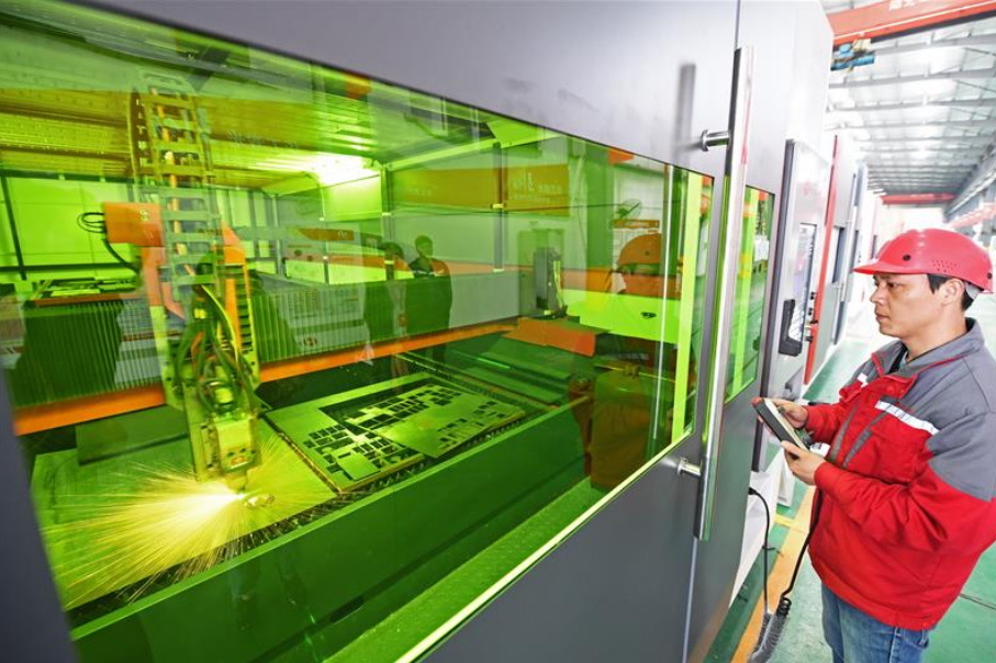 华工科技激光智能装备制造基地,该公司自主研制的12000W激光切割机正在为客户进行切样。该设备核心部件——激光器及切割头均自主研制,价格仅为同类进口设备的一半,产品远销欧美、东南亚国家,目前在韩国切割机市场销售中占据第一。湖北日报全媒记者 李溪 通讯员 俞智君 摄