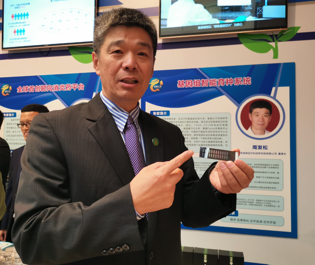 在成果展示区,记者注意到一张薄薄的、仅有身份证一半大小的育种芯片,它是由国家特聘专家、武汉双绿源创芯科技研究院有限公司董事长周发松博士及团队研发而成。这个育种芯片中,已植入被科学家破译出的4万个水稻“基因信息”,芯片的一面上有24个“小方块”即为被检测样品。只需剪取水稻幼苗的一小段鲜嫩叶片并分离DNA,将DNA与芯片进行对比、检测,就能很快分析筛选出优良基因的植株,从而为育种提供高科技技术支持。周发松说:“在动植物的品种培育中用‘芯’优选,比如说,泰国香米很受欢迎,实际上是因为水稻里有天然的香味基因,把我们现在种的水稻品种跟有香味的水稻品种进行杂交,培育出的品种既能适应湖北省的气候条件,又能具备泰国香米的品质,又含有抗氧化抗衰老的脂肪酸,还有抗病抗虫的特性,达到好吃、健康、安全的要求。”