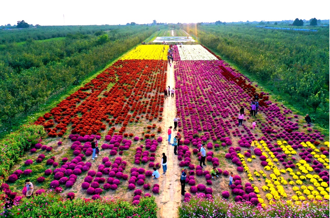 国庆菊,是国庆节期间开放的菊花,五颜六色,隽美多姿,不以娇艳姿色取媚,却以素雅坚贞取胜,盛开在百花凋零之后,象征着国家祥和欢乐,繁荣昌盛。人们爱它的清秀神韵,更爱它凌霜盛开、西风不落的一身傲骨。菊花在运城市有大面积种植,但像临猗县三管镇这样集齐红、粉、白、黄各色的菊花园并不多见。
