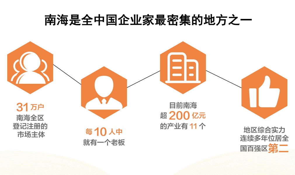 南海是全中国企业家最密集的地方之一,每10个人中就有一个老板。经过40年发展,南海已经成为华南最重要的制造业基地之一,地区综合实力连续多年位居全国百强区第二。