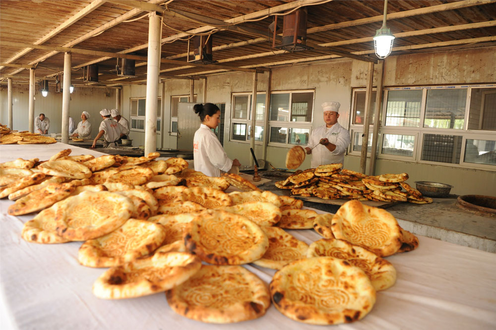 10月21日,柯坪县玉尔其乡托玛艾日克村杏乡打馕合作社员工在摆放打好的馕。该合作社已吸纳76名贫困户就业。新疆日报记者秦梅花摄