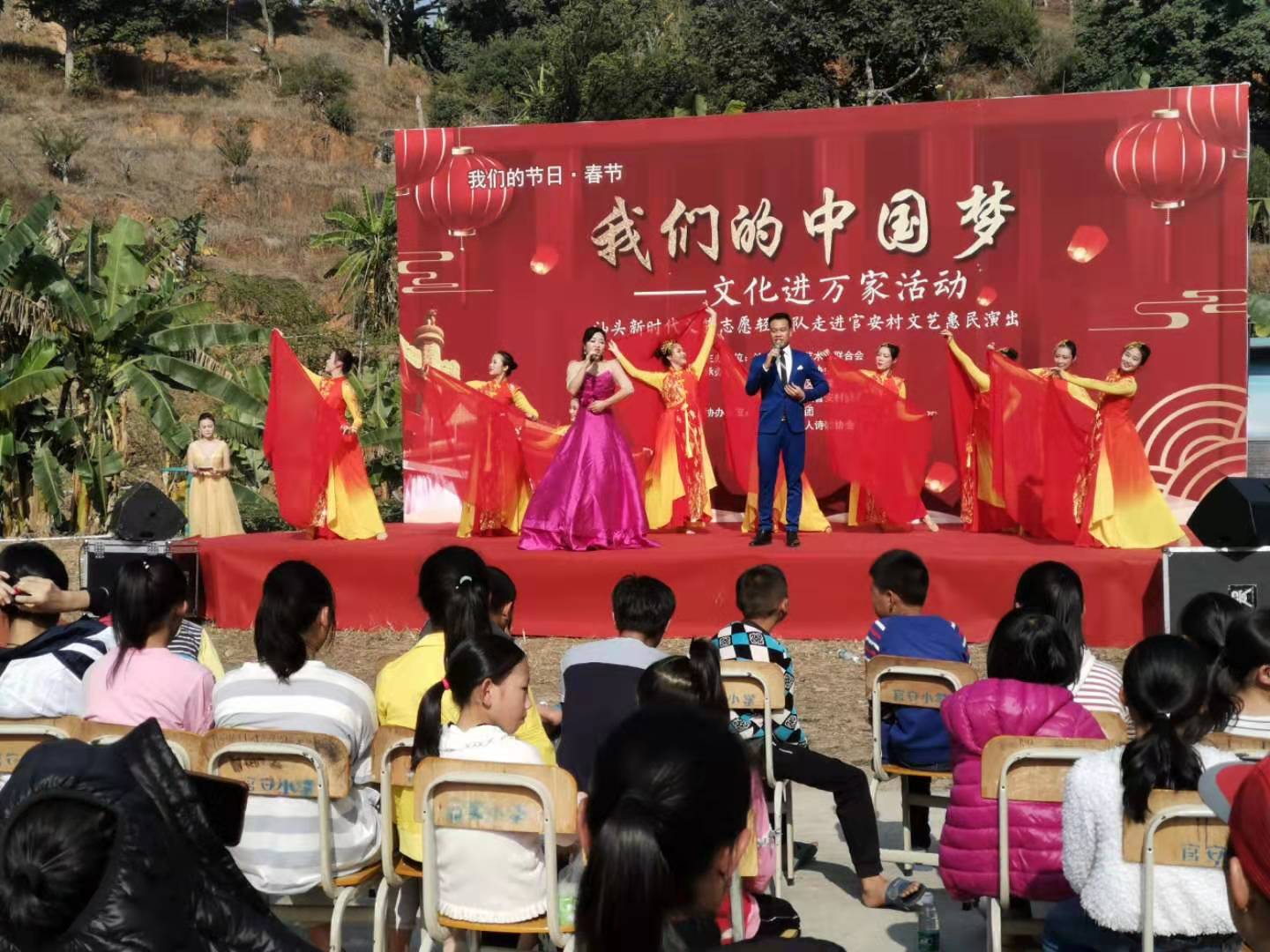 为深入学习贯彻党的十九届四中全会精神,扎实开展“不忘初心、牢记使命”主题教育活动,12月24日,由汕头市文联主办,汕头市舞蹈家协会、汕头市歌舞团、汕头市书法家协会、潮阳区文联和金灶镇官安村委会承办的“我们的中国梦——文化进万家活动” 汕头新时代文艺志愿轻骑队走进官安村开展文艺惠民演出。