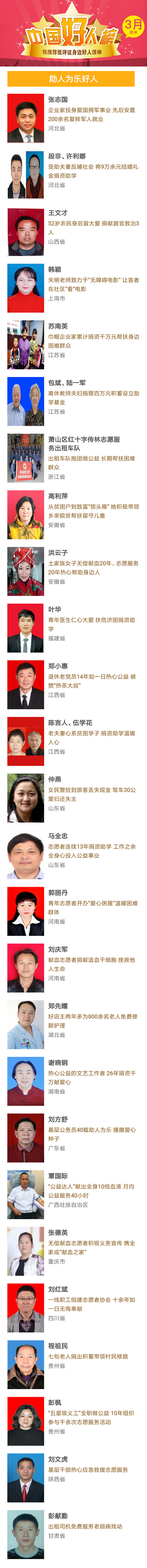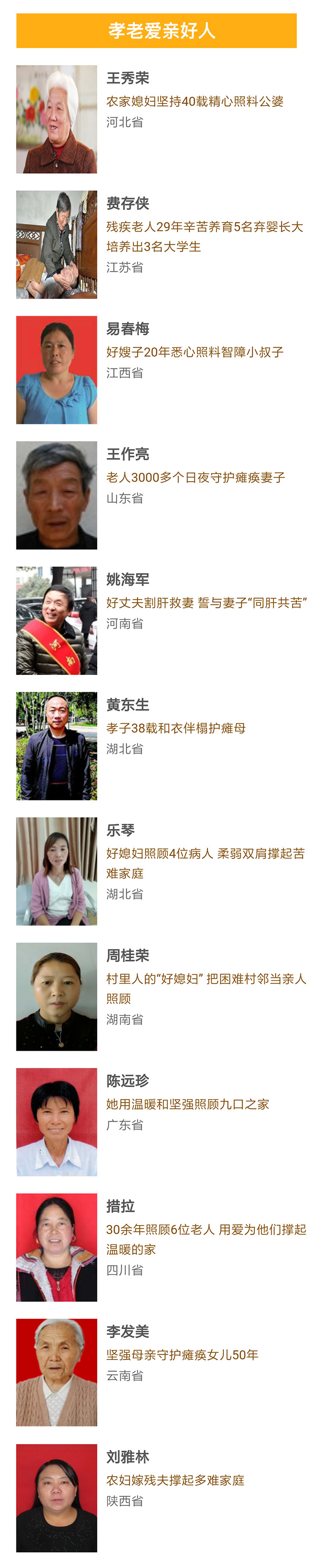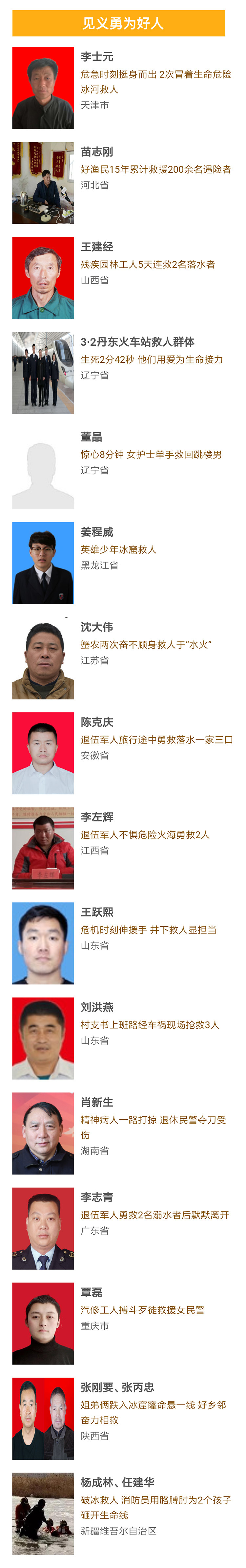 在上榜好人中,有将结婚礼金全部捐赠助学的年轻夫妻段非、许利娜,有捐出百万元全部积蓄资助贫困学生的离休教师夫妇包斌、陆一军,有为救轻生女子光荣牺牲的年轻消防战士刘磊,有恪守父辈承诺精心保管红色史料的郭海波,有坚守脱贫攻坚一线的好干部张渠伟,有扎根基层一线的好记者谌贻照……网友称赞:好人就在身边,好人温暖着全社会。