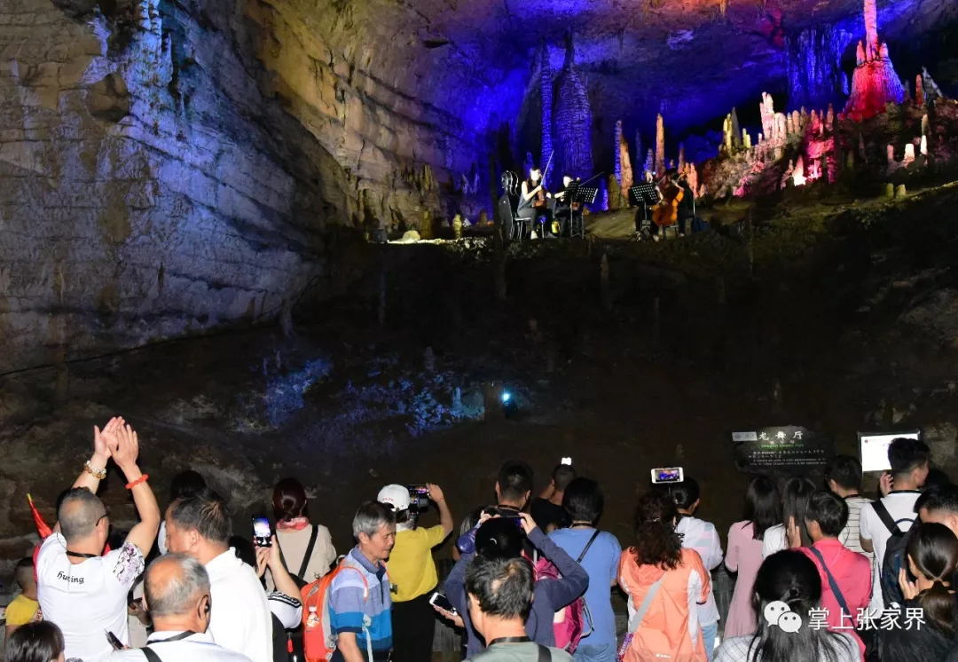 10月2日上午,张家界·乌克兰交响乐团来到黄龙洞景区生态广场、水车广场、洞内龙舞厅等地,为游客演绎《北京喜讯到边寨》《我和我的祖国》等经典爱国曲目,数千名游客观看演出并参与同唱爱国歌曲的互动。(鄢渊 李远明)