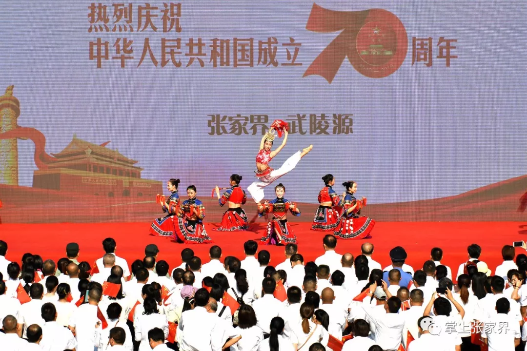 10月1日上午,张家界易程天下环保客运有限公司在武陵源核心景区标志门广场站、森林公园站及天下第一桥站分别上演“礼赞新中国,奋进新时代”大型快闪活动,庆祝中华人民共和国成立70周年。(董明勤 邓道理 吴勇兵)
