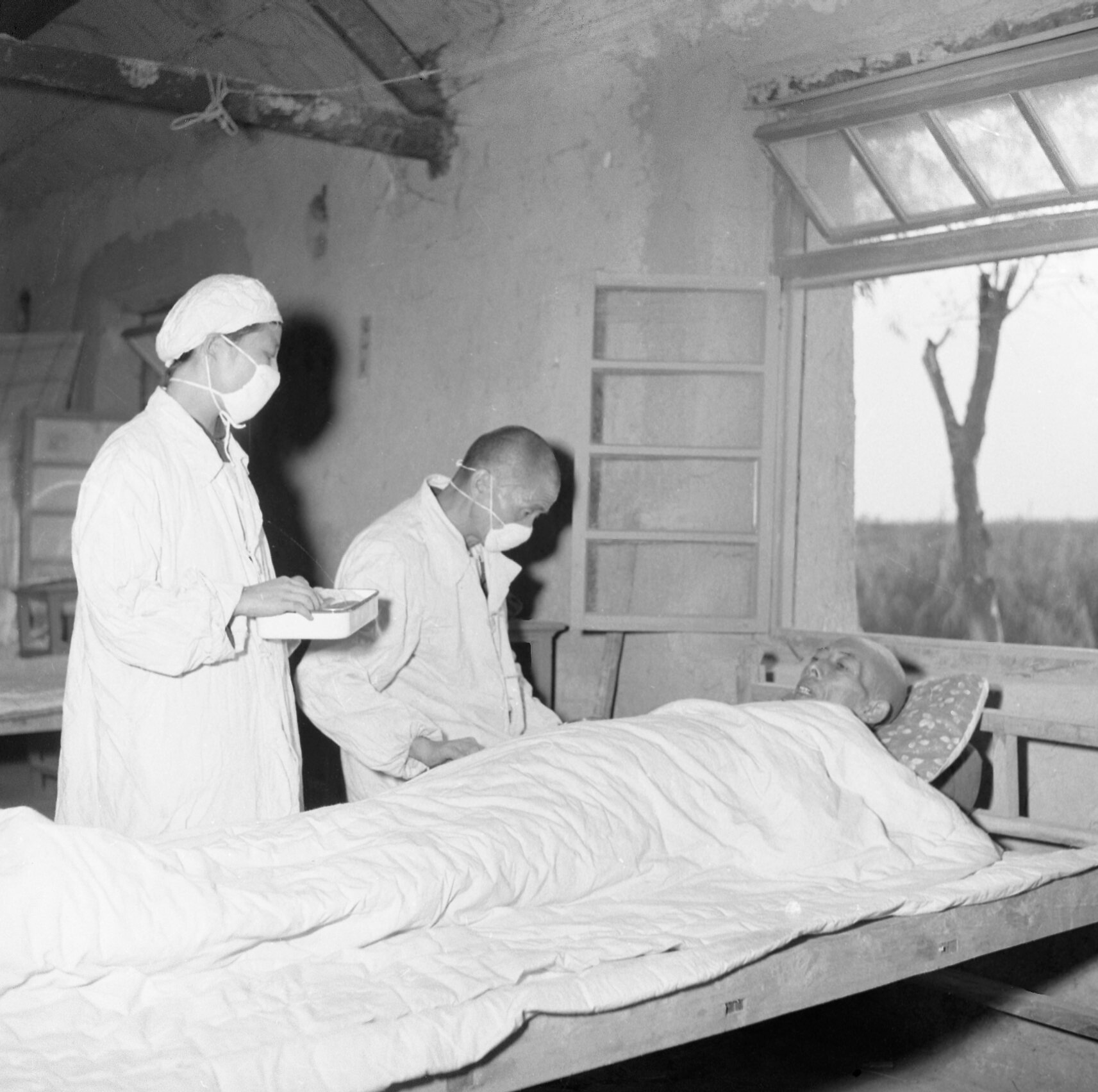 70年来,几代村医坚守农村,守护着一方百姓的安康。图为涡阳县纪伦岩公社卫生所,村医为社员检查身体。安徽日报资料图