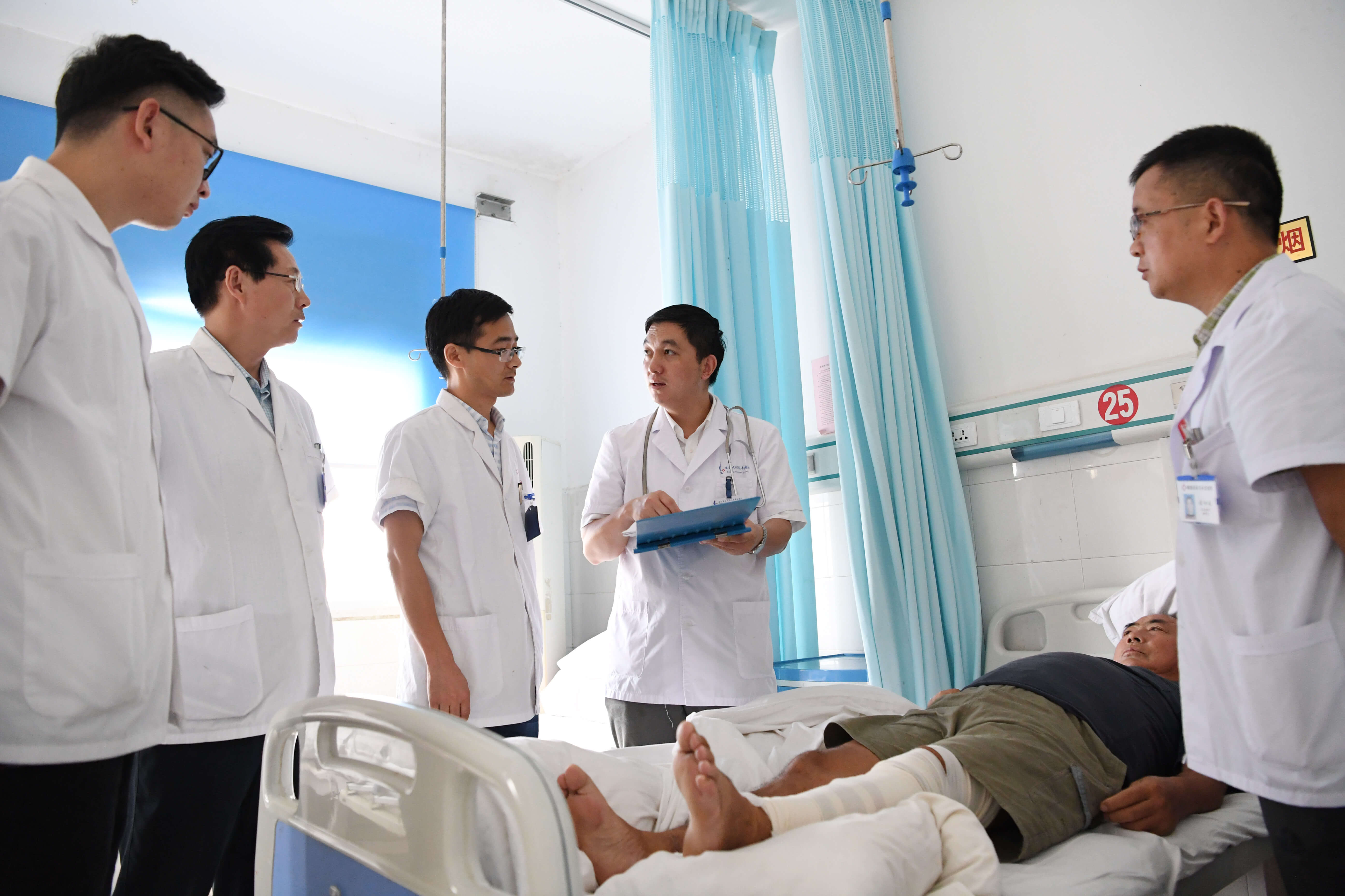 8月30日,驻村医生、安徽医科大学附属阜阳医院主治医师张治业(左四)在六安市裕安区单王乡卫生院查房,并为乡卫生院医护人员讲解相关诊疗方法。