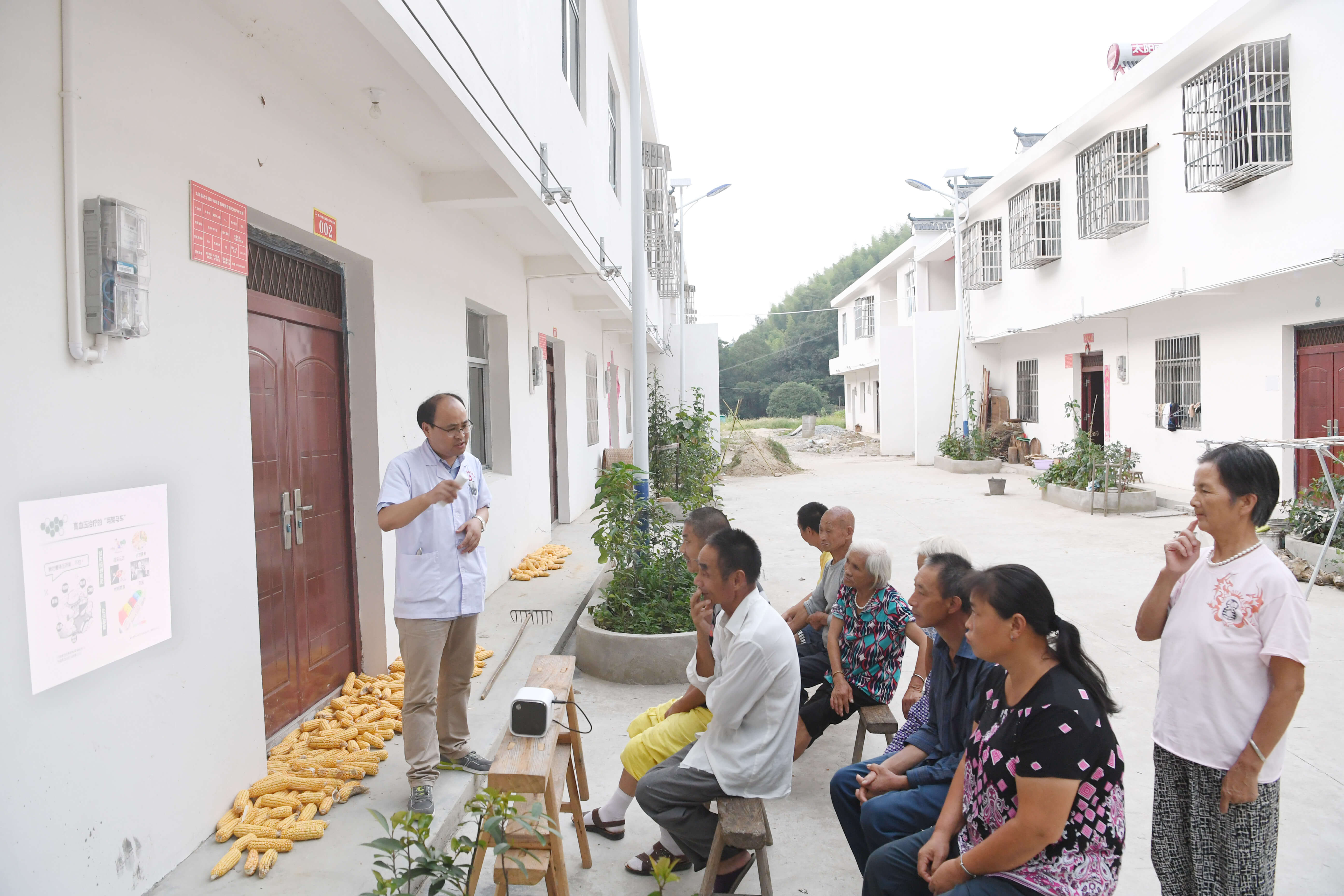 8月21日,驻村医生、安徽省中西医结合医院主治医师杜益刚(左一)在太湖县天华镇西冲村为村民讲解高血压防治知识。