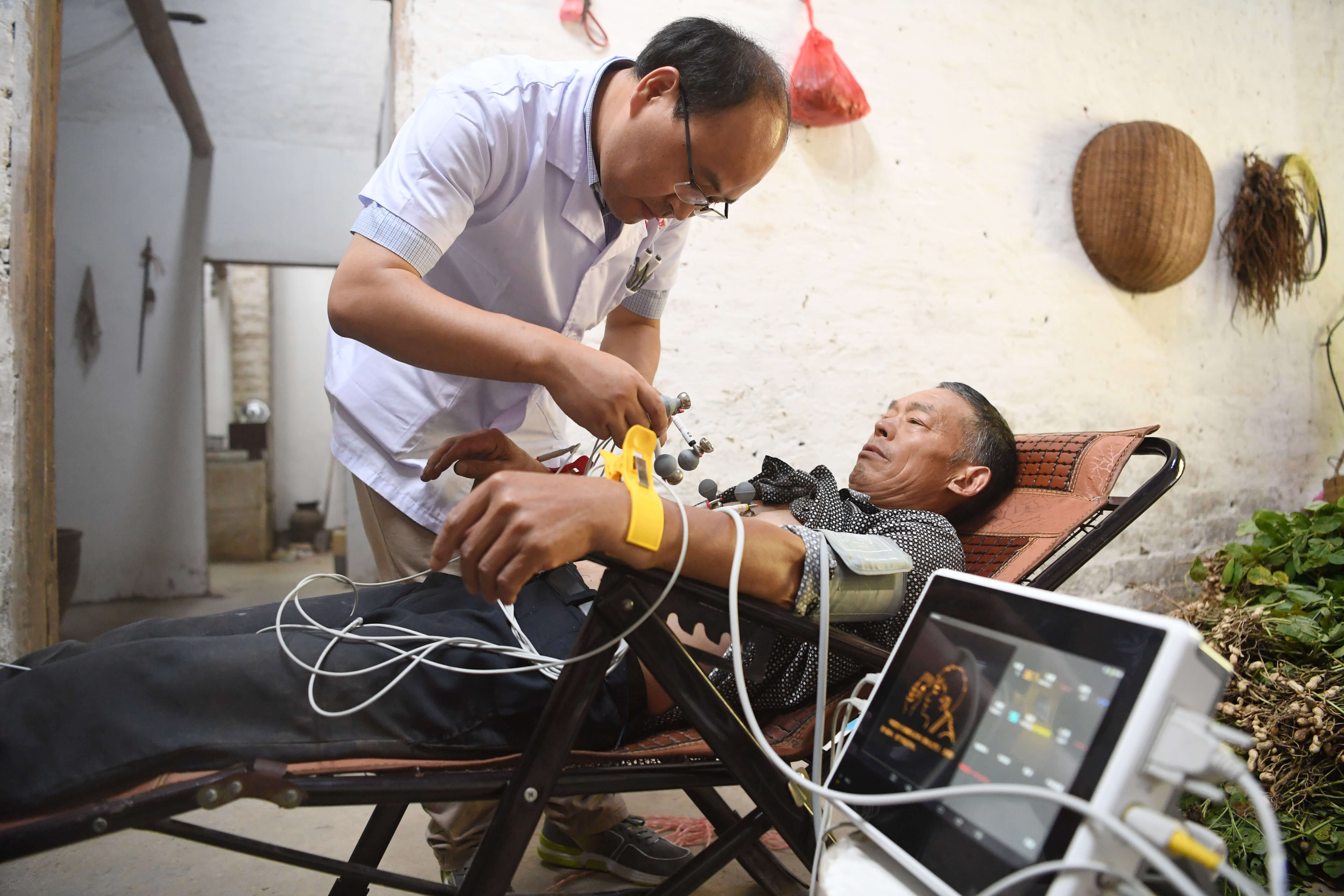 8月21日,驻村医生杜益刚在太湖县天华镇西冲村为腿脚不便的贫困户上门体检。