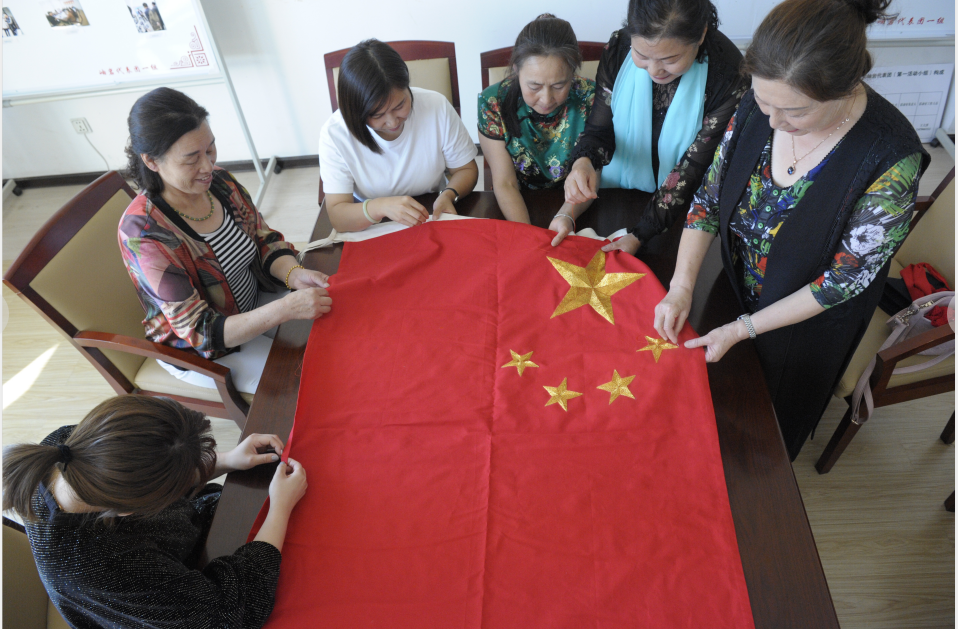 日前,鞍山岫岩满族自治县文化馆组织满族刺绣培训班的绣娘们,以绣制国旗的方式,庆祝新中国成立70周年。
