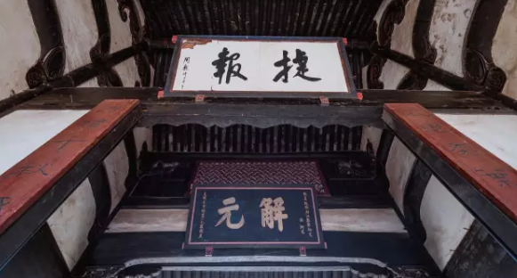 “明朝天顺六年(1462)的春天,肃雍堂刚刚落成,又正好赶上雅溪卢氏第十四世孙、肃雍堂堂主卢溶夫妇的五十大寿,而且同年他们的大公子卢楷乡试夺得头魁的捷报传来,真可谓三喜临门。于是把头门改名为捷报门。”