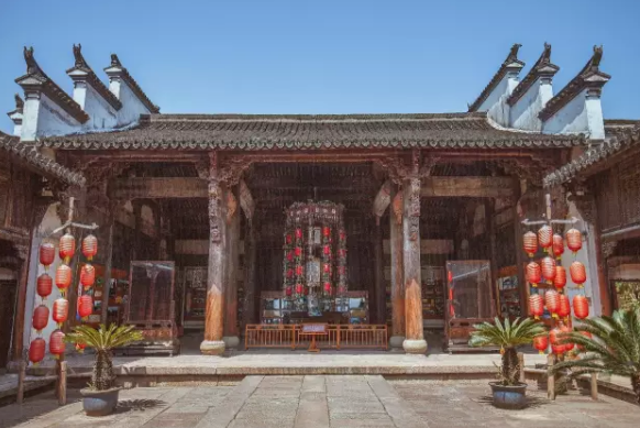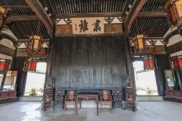 卢宅总布局以卢氏大宗祠为中心,复荆、肃雍、树德三堂三足鼎立,园林、牌坊、厅堂更是层层叠叠,错落有致。其中肃雍堂四周雅溪环绕,厅堂宅地构筑宏伟,装饰雕刻豪华艳丽,建筑风格凝重古朴,浓缩了中国古代社会千年精华。