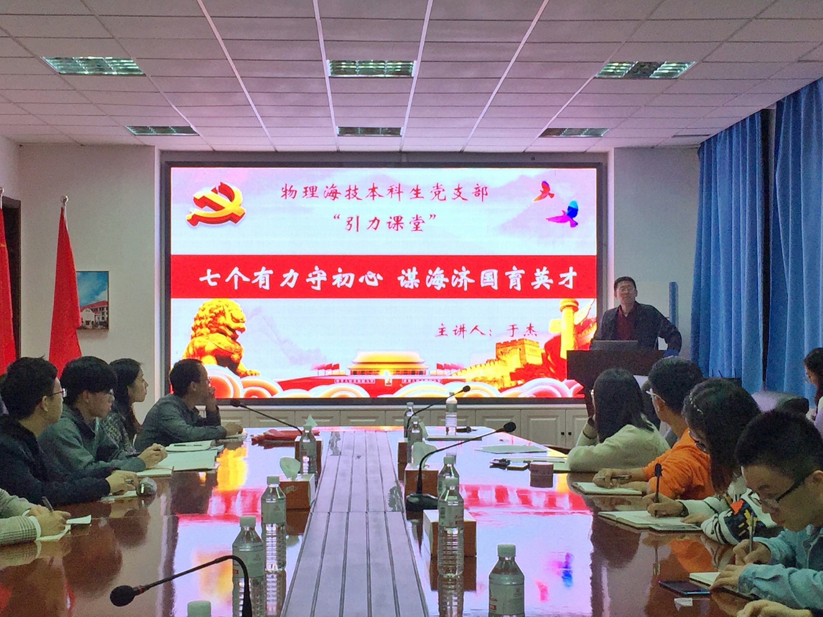 “政治上的坚定、党性上的坚定,都离不开理论上的坚定。支部党员要当好理论学习的先行者,将党的理论内化于心、外化与行,筑牢思想之基。”物理海技本科生党支部支委会一班人就此达成共识。在学院“不忘初心、牢记使命”主题教育开展过程中,他们结合学院和专业特色,创新传统党课模式,由以前的“一人讲”向“大家讲”拓展,由“说教式”向“座谈式”“分享式”“探讨式”延伸,由过去单纯讲理论、讲党章党规,转变为利用身边典型故事来激励感染党员,既富党性,又接地气。