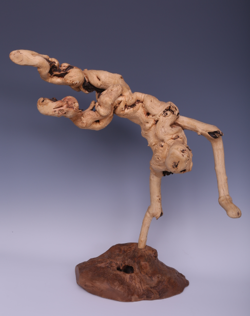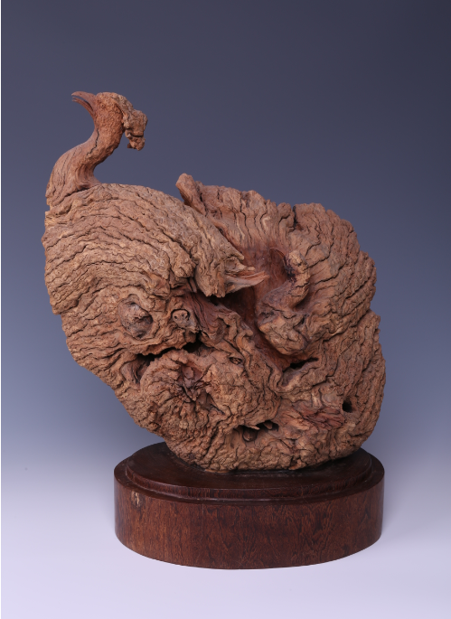 “三刀,即一卷、二乱、三点缀。应用卷刀一定要顺理成章,按照树根纹路韵律用刀,不可伤其自然姿态,卷刀要用得有节序、有规律,要用腕力运用象征、抽象、变形、夸张等手法,一气呵成。乱刀并不是乱刻、乱截,应强调刻画有序、截其多余,要考虑恰到好处,拼凑之时要留有余地,不破坏树根的内在自然神形和重要部位。乱刀是去其璞露其真的关键刀法。树根上的疤疙瘩纹理、色泽、凹凸、线条,则采用点缀巧技,做到点缀得体,位置恰当,达到浑然一气,天成有道。需要处理之处,要用刀修,再用火烤,以创出天然的斑疤之态,使之整体流畅,形态逼真。”陈志华说。