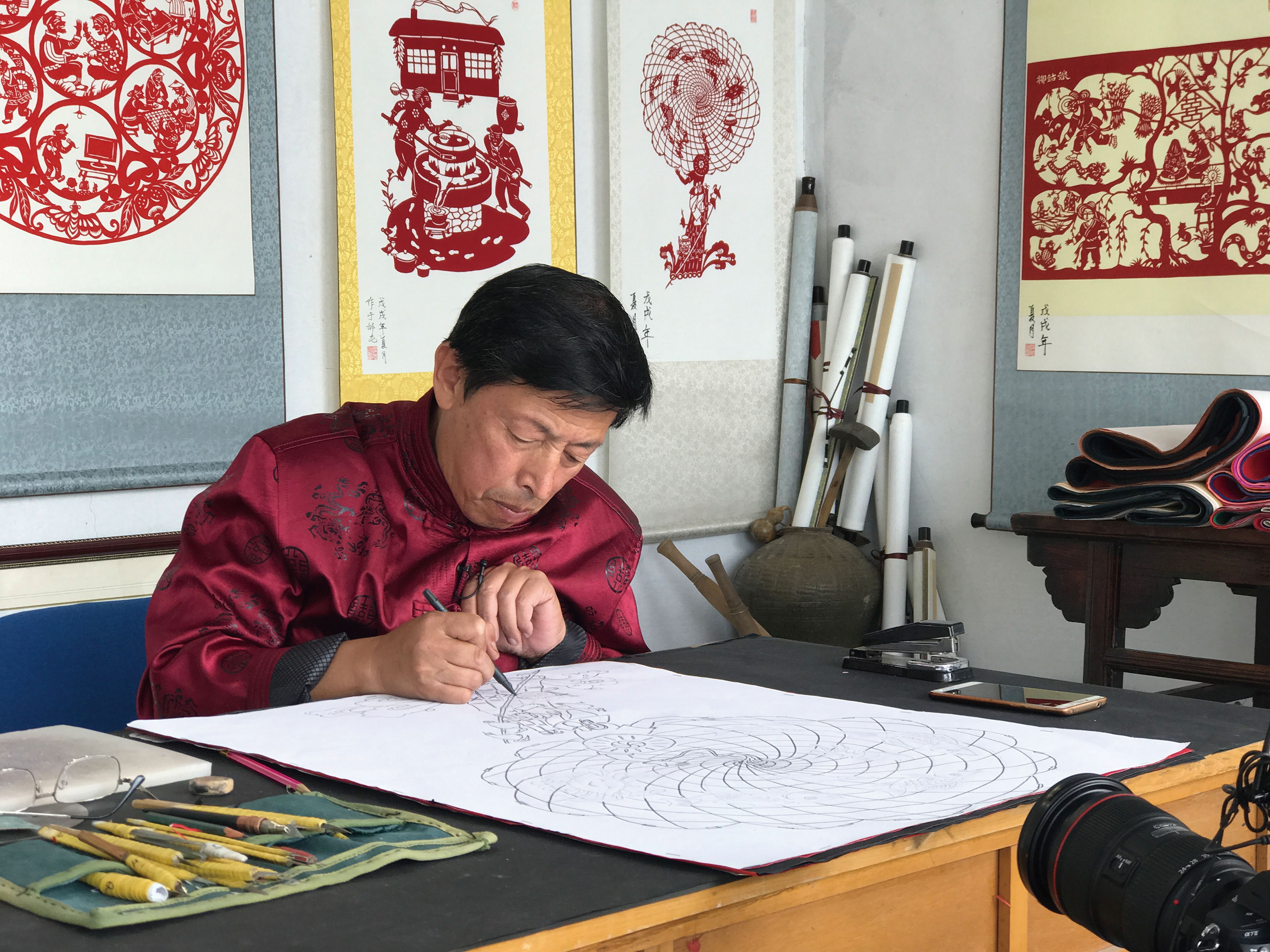 与沉默寡言的汪秀霞不同,做过乡村医生的赵志国对剪纸有着更深刻的表达。“我家族里的每一位父辈以上的成员,都是我的老师”,深受工匠之家的艺术熏陶,赵志国从小就对民间艺术有着高于旁人的喜爱。他3岁就背个小书包,别的不玩,没事就把包里的笔和本拿出来“瞎划拉”——画画。七八岁的时候就正式拿起剪刀剪纸,跟着爸爸妈妈姑姑学剪纸。从最早的简单脱稿剪纸,到比较复杂的有稿剪纸,家中长辈给予赵志国最直接的技艺传授。在做难度颇高的脱稿剪纸时,妈妈告诉他要做到意在剪子先,心里有样子,用眼睛把样子画在纸上,才能做好脱稿剪纸。