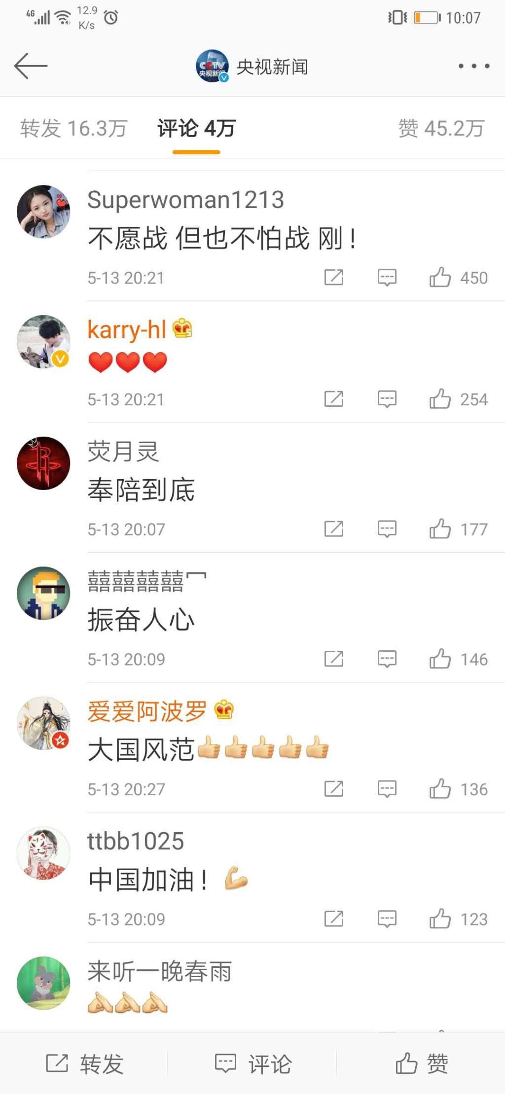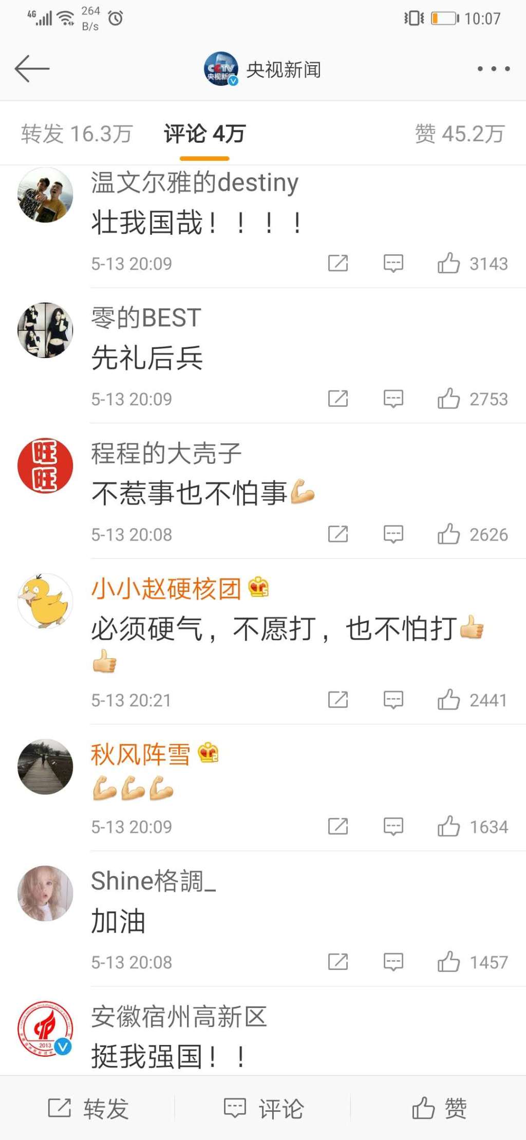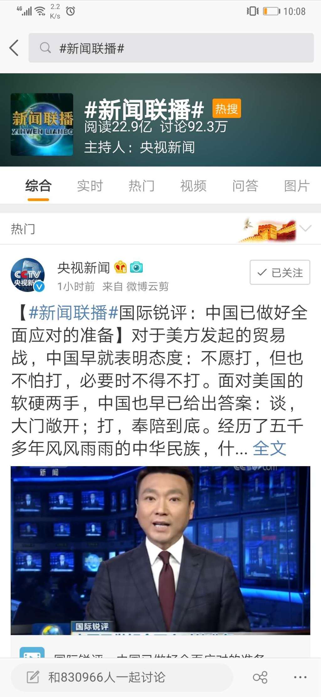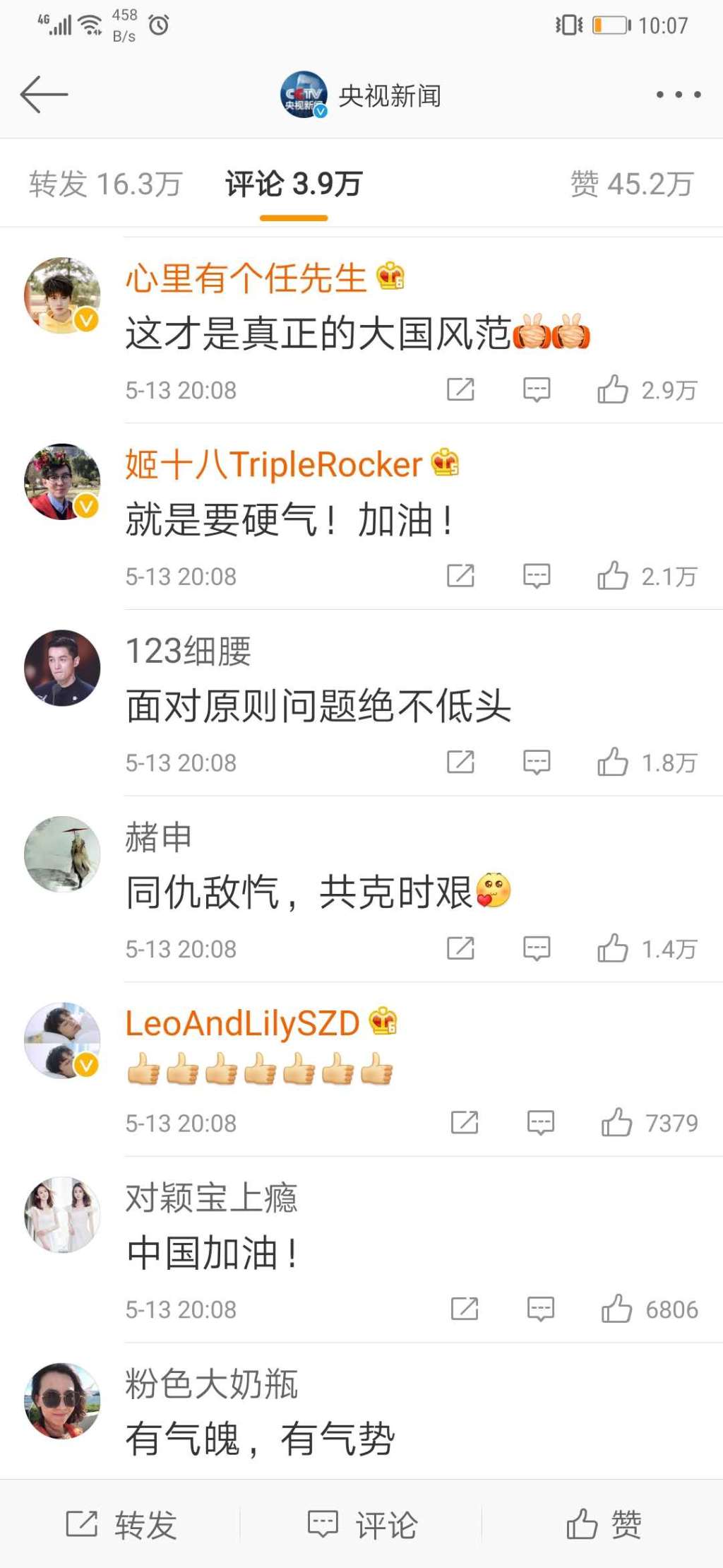 节目播出后,央视新闻官方微博转发数小时,阅读量就已突破3600万,播放量超过4600万,单条微博的点赞数量超150万,网友留言热烈,纷纷点赞这篇评论言之有理、“威武”“霸气”,同时,表示大力支持政府的反制措施,“面对原则问题绝不低头”。