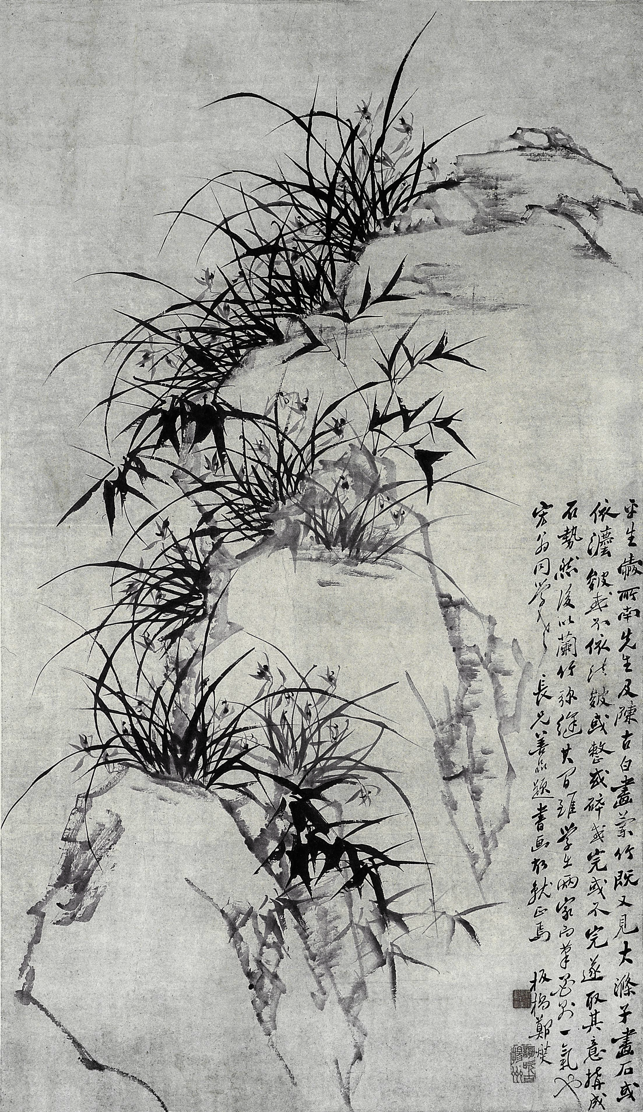 题识:平生爱所南先生及陈古白画兰竹,既又见大涤子画石,或依法皴,或不依法皴;或整或碎,或完或不完。遂取其意构成石势,然后以兰竹弥缝其间,虽学之两家而笔墨则一气也。宏翁同学老长兄善品题书画,故就正焉。