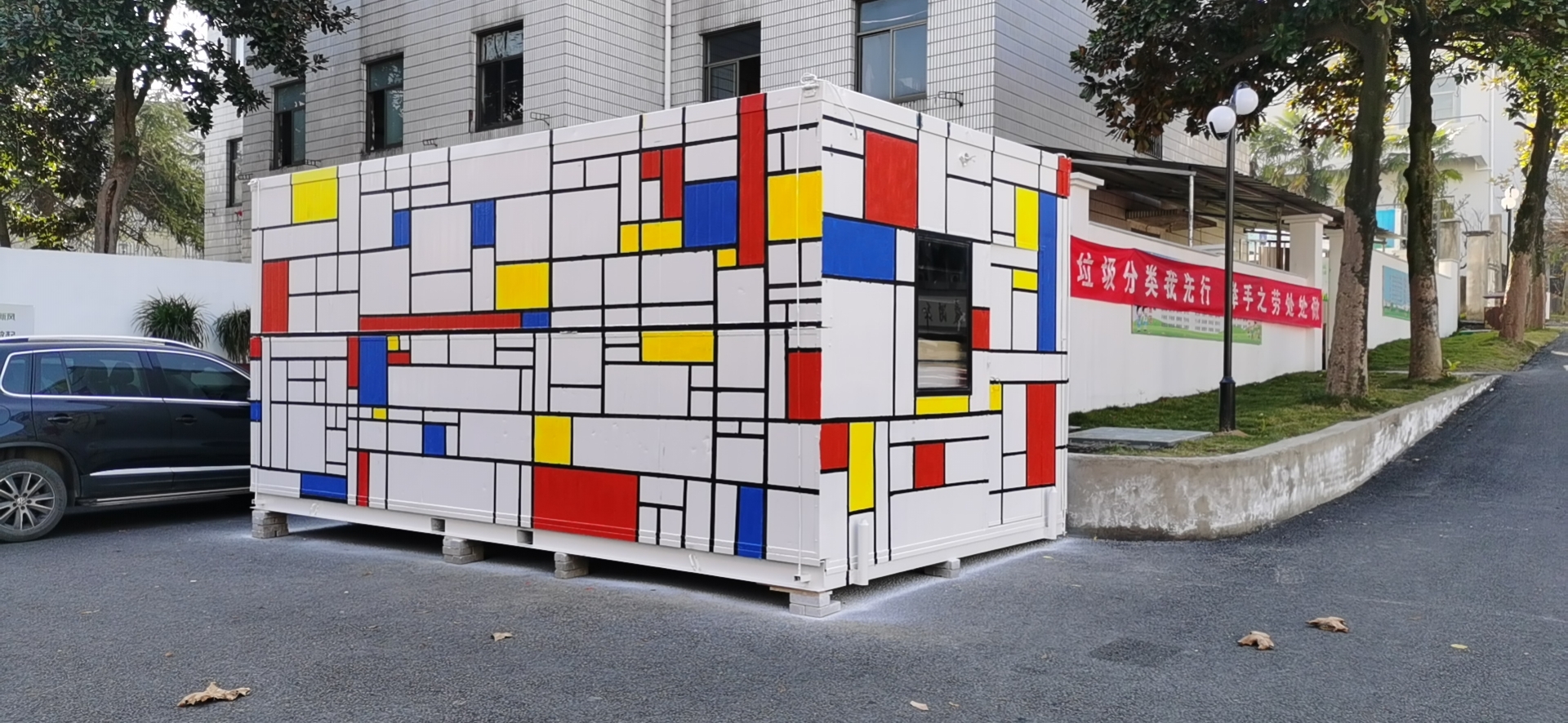 于是,当这个满载着爱心的“大家伙”被送抵学校后,师生们立刻自己动手进行装饰,结合学校的整体环境,在集装箱的外墙上绘制了亮丽活泼的柯布西耶风格图案。同时,在内部放置可供学生休息的座椅板凳,还有各种课外书籍,让等候在此的学生可以度过一段温馨又快乐的放学时光。