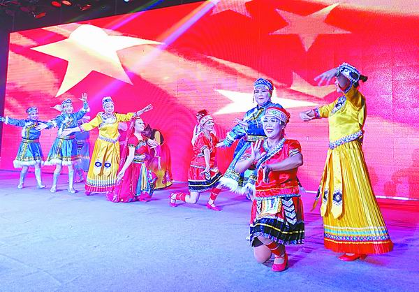 2019年6月13日晚,湛河区民间艺术团舞蹈队队员在火车站广场表演《母亲是中华》 姜涛 摄
