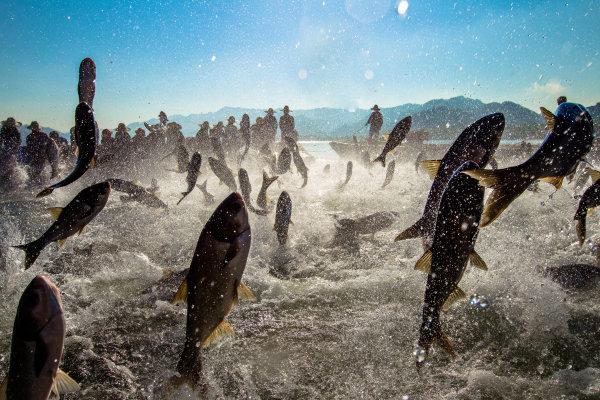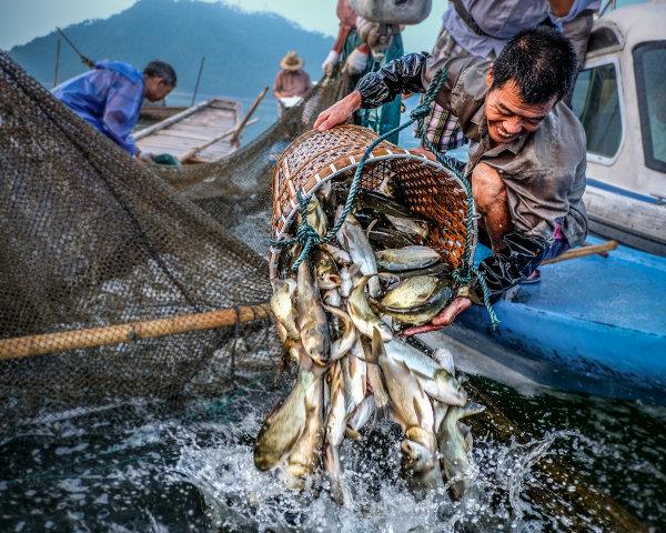 初冬的千岛湖分外冷艳,不过东南湖区的一个角落却很是热闹。随着一阵“嘿哟、嘿哟……”的号子声,20多位千岛湖捕捞队队员收拢起一张百余米长的渔网,成群的鲢鳙鱼受到惊吓,争相跳出水面,围观的游客不时掏出手机抓拍,队长叶志清清了清嗓门喊着:“大家再加把劲,这一网少说有5万公斤!”