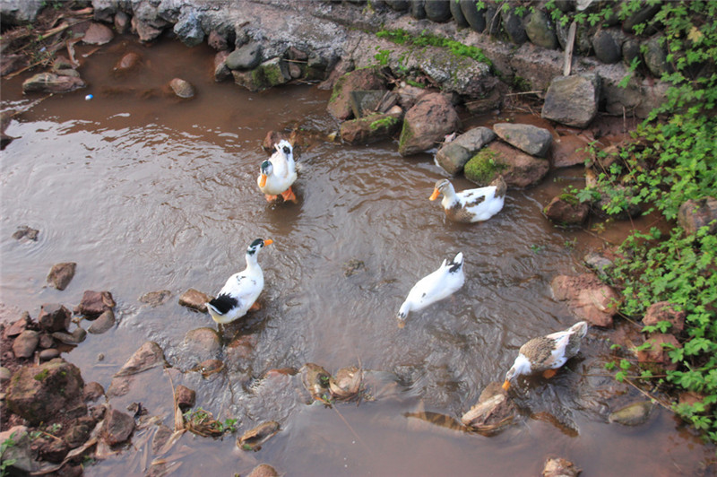小溪里,溪水清澈见底,一群鸭子悠闲自在地游着,时而钻进水里觅食。