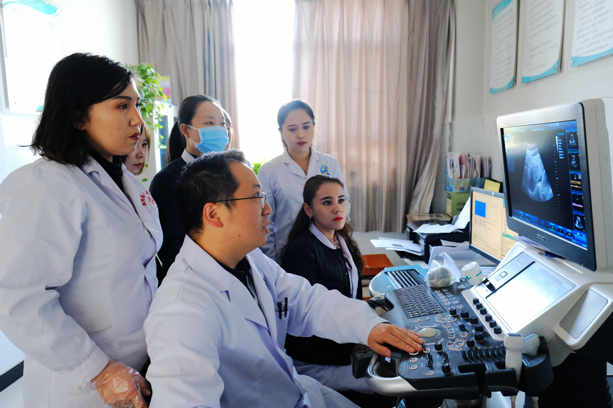 曾毅医生正在指导当地医生工作,她说:“我希望尽自己最大的努力,让自己成为一颗小小的火种,点燃一束火把,留下一支带不走的医疗队,造福于新疆的兄弟姐妹。”
