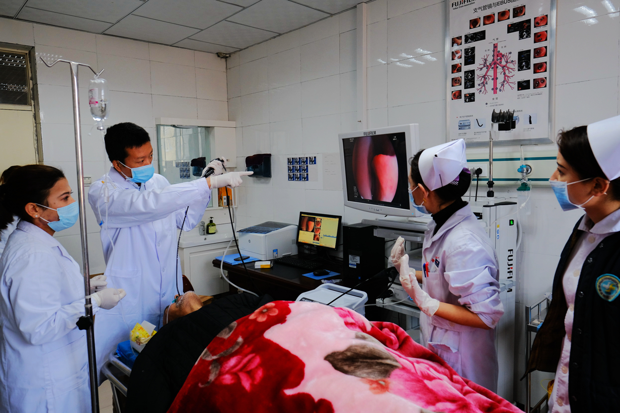 主动请缨援疆的钟长镐医生正在为病人做无痛支气管镜手术,身旁有两位维吾尔族女医生正在协助,他一边操作,一边认真讲解。