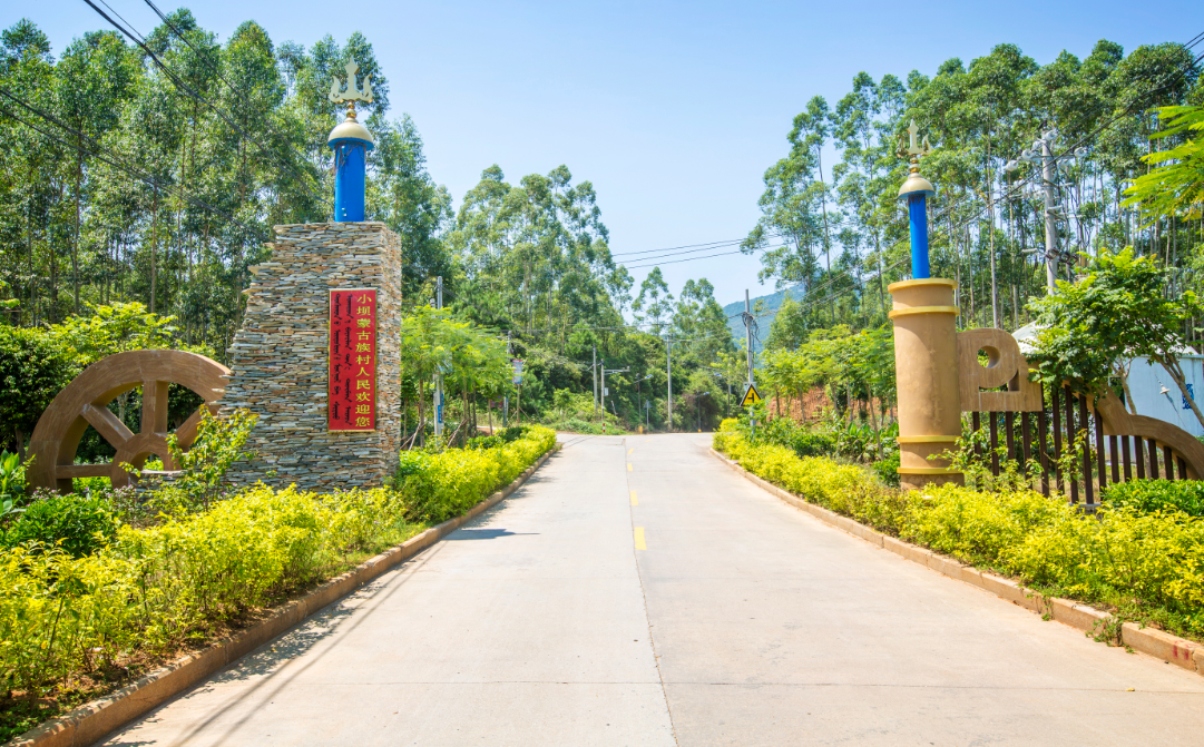 小坝村沿途的公路牌,其标识果然与寨外明显不同,牌上的文字全为蒙汉双语,路边的“马头琴”景观灯和散落的蒙古包,浓郁的蒙古族风情。