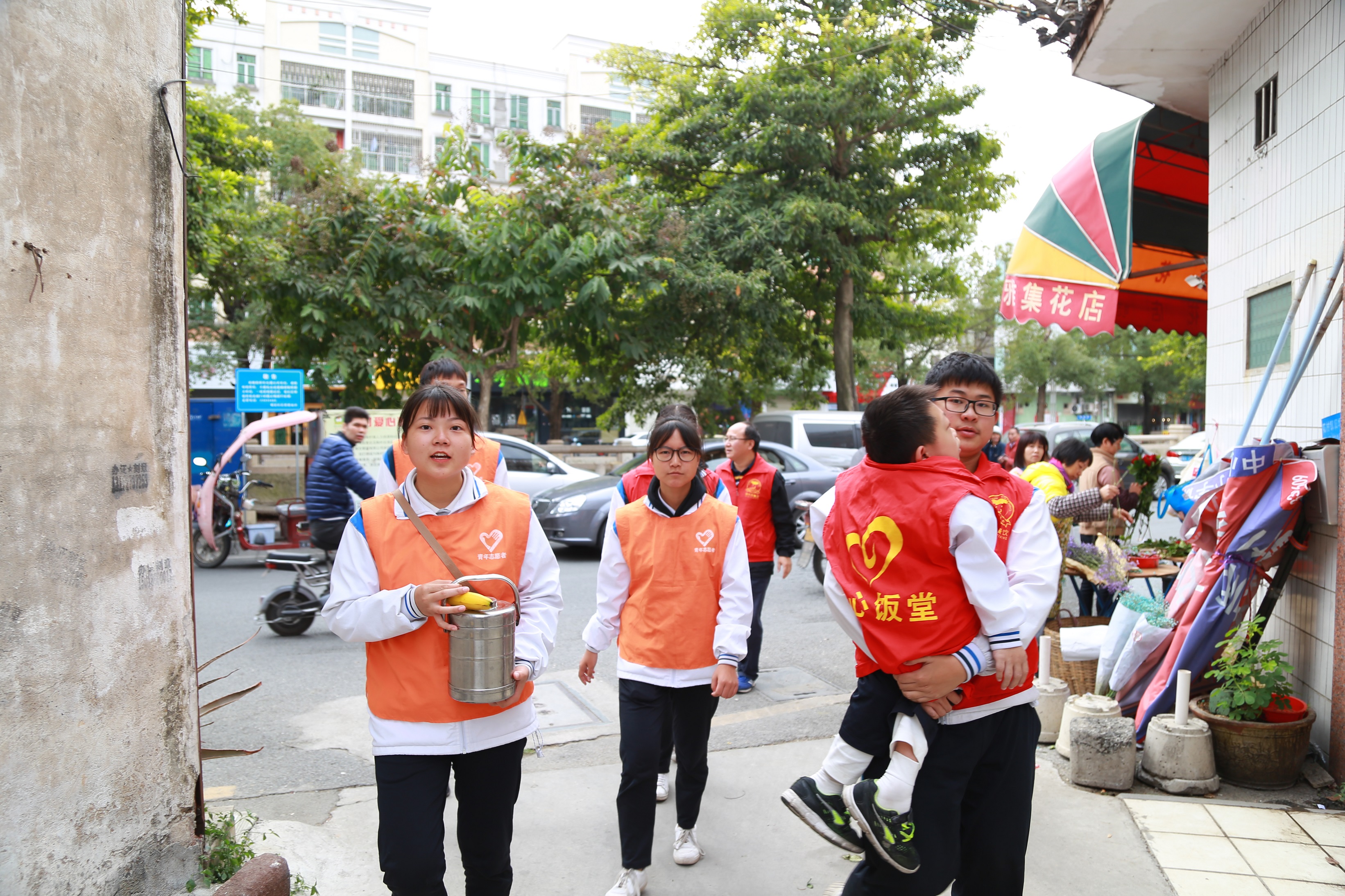 12月5日,黄鸿强抱着何子健当起了校外义工,为老人送爱心餐。