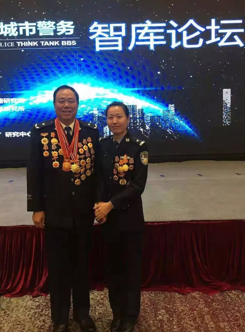 在参加第三届全国城市警务智库论坛时,侯金知与全国公安系统一级英模邱娥国(左)合影。