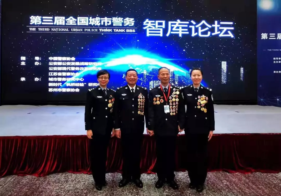 11月26日,侯金知与参加第三届全国城市警务智库论坛的部分全国公安英模代表合影。图左起杨蓉、李国富、陈晓馨、侯金知。