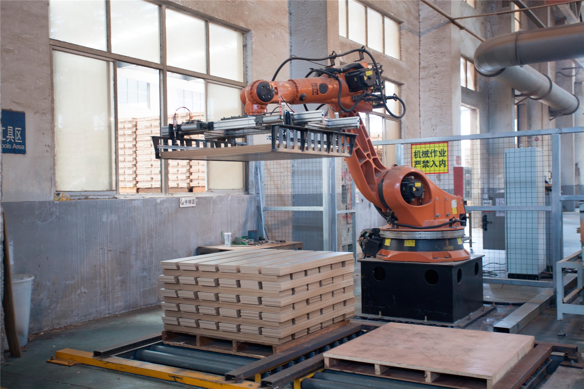 绿色家居生产线智能化改造,真正实现“机器换人”,图为码堆机器人正在作业