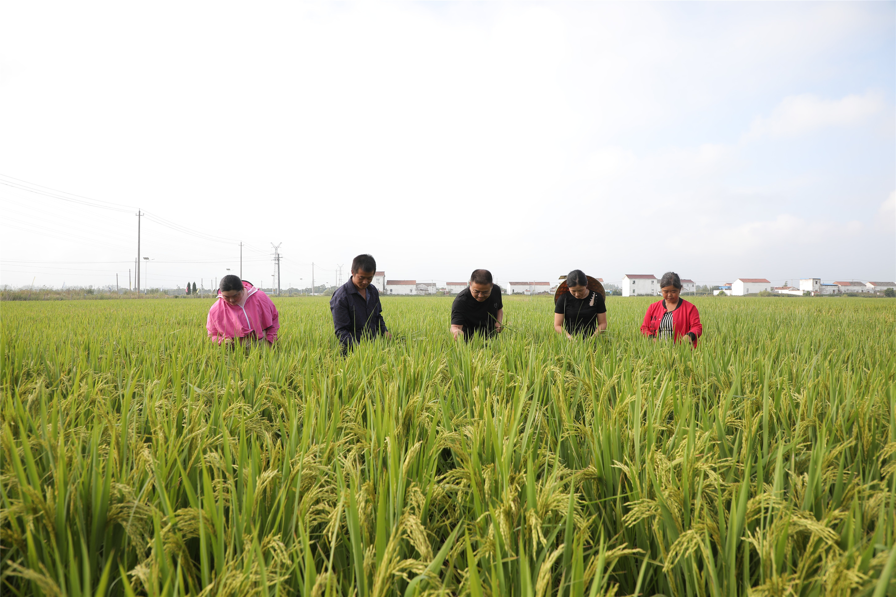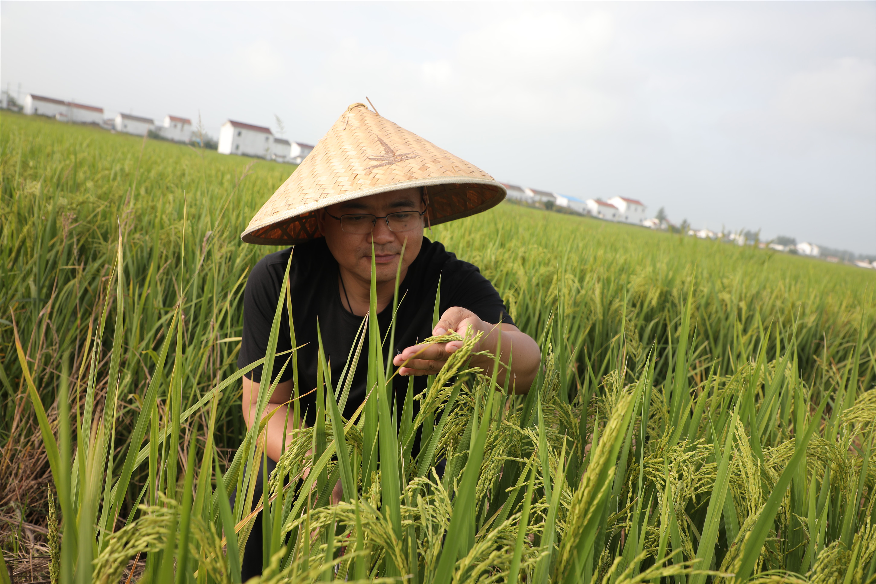 颜刚在田地里查看水稻生长情况