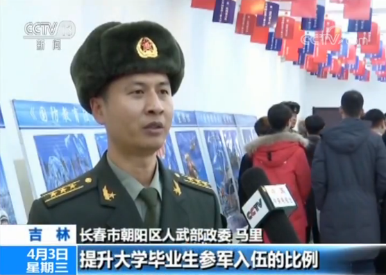 长春市朝阳区人武部政委 马里:提升大学毕业生参军入伍的比例,是今后征兵的发展趋势。同时,对大学生本身来说,也是一个很好的自身发展渠道,立足长远发展,能够在部队充分释放自己的专业才华和技能。