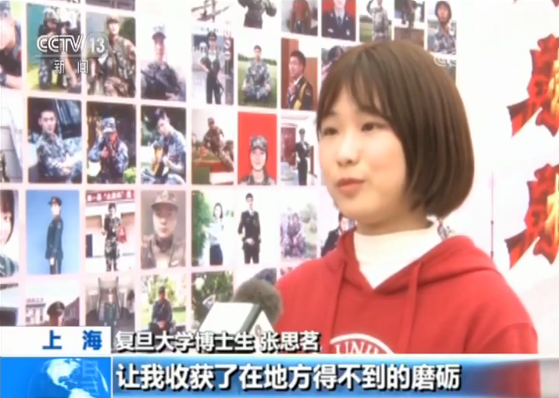 复旦大学博士生 张思茗:从军的经历让我收获了在地方得不到的磨砺,也让我树立起了为了目标不断挑战的勇气。退伍复学之后,我又享受到了国家针对大学生的考研考博优惠政策。军营也是一所大学,会让你学到坚定目标、绝对执行、超越自我的特别锤炼。