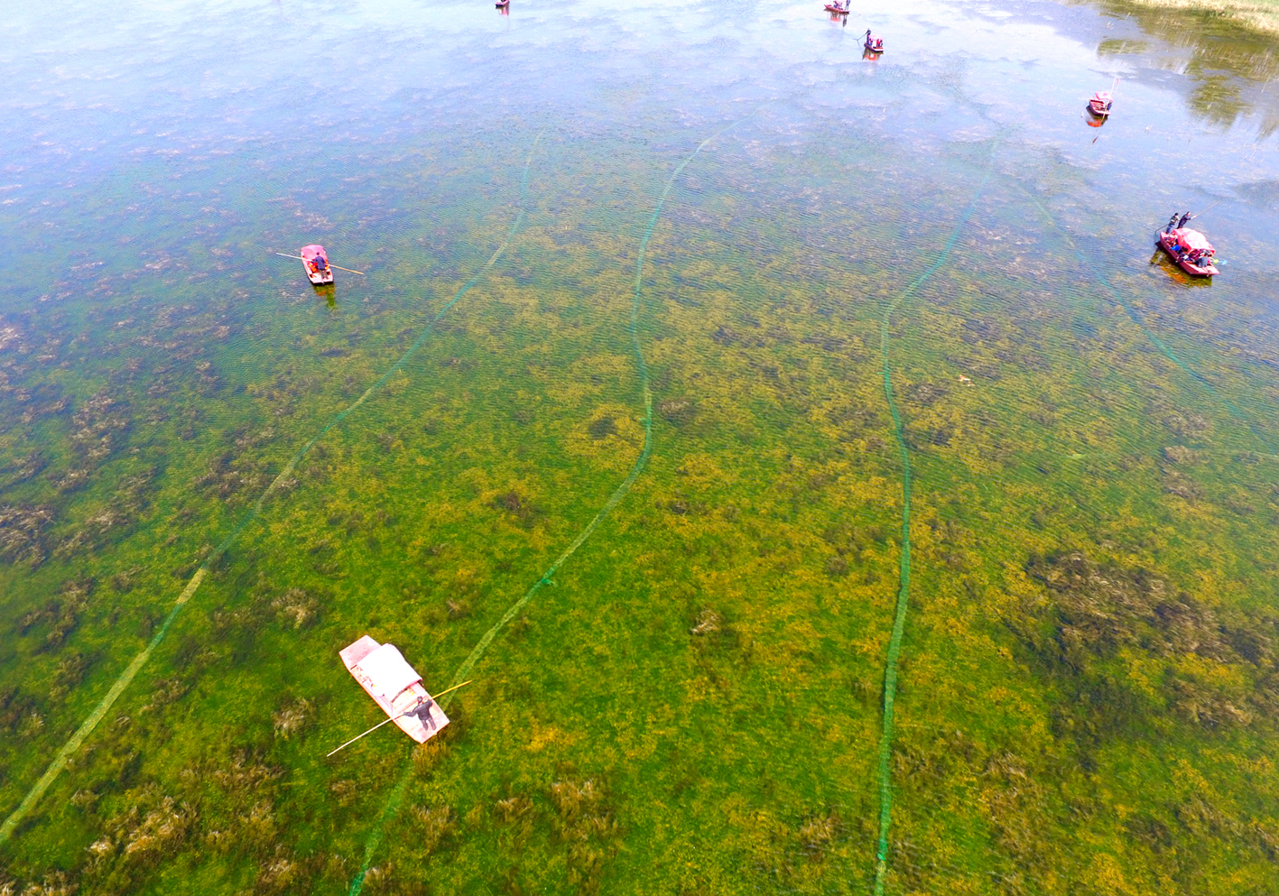 驱车一路向东,记者来到刘口镇天沐湖,一望无际的水面上,几只乌篷船离开了码头,向远方划去。