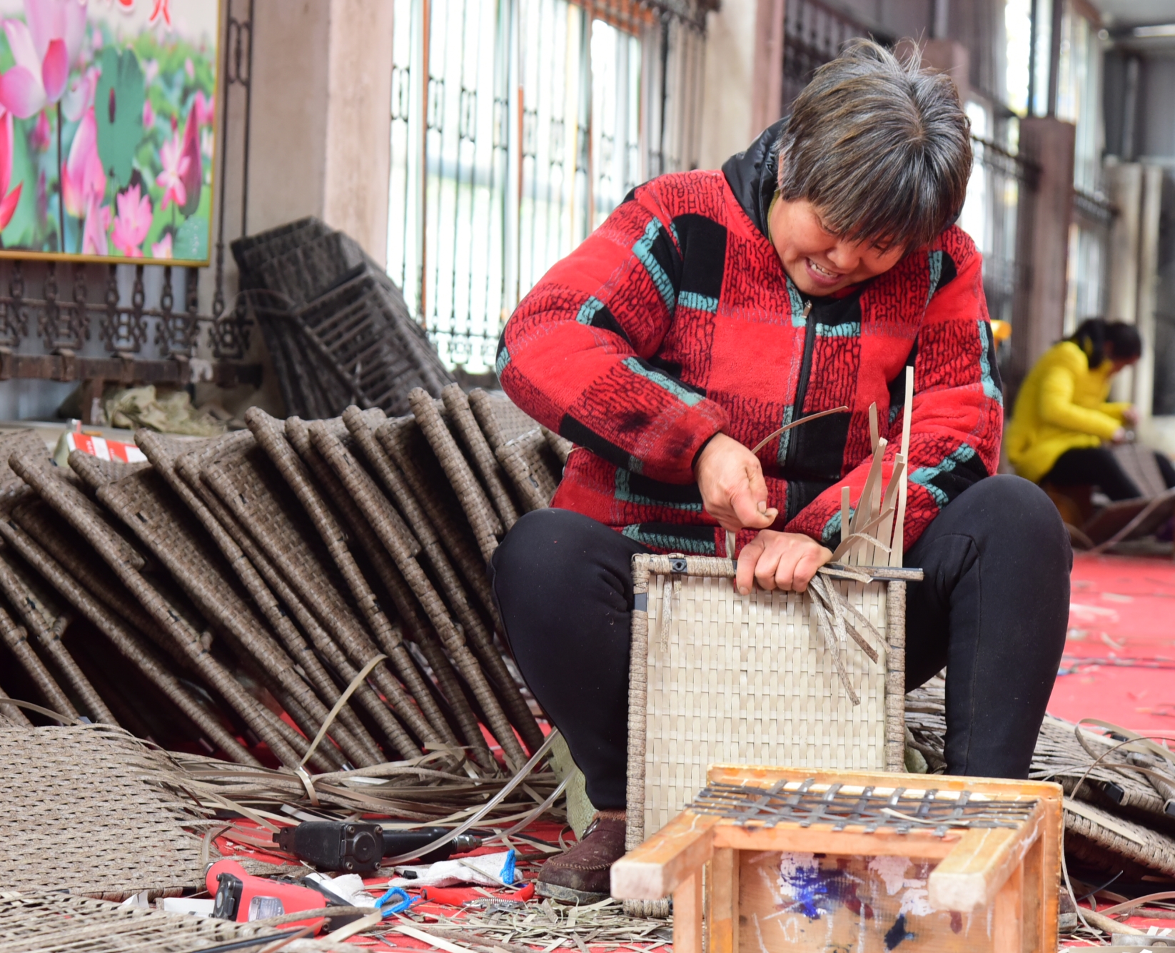 群众在邓州市林扒镇土门社区的藤制品有限公司工作 郑雪 摄