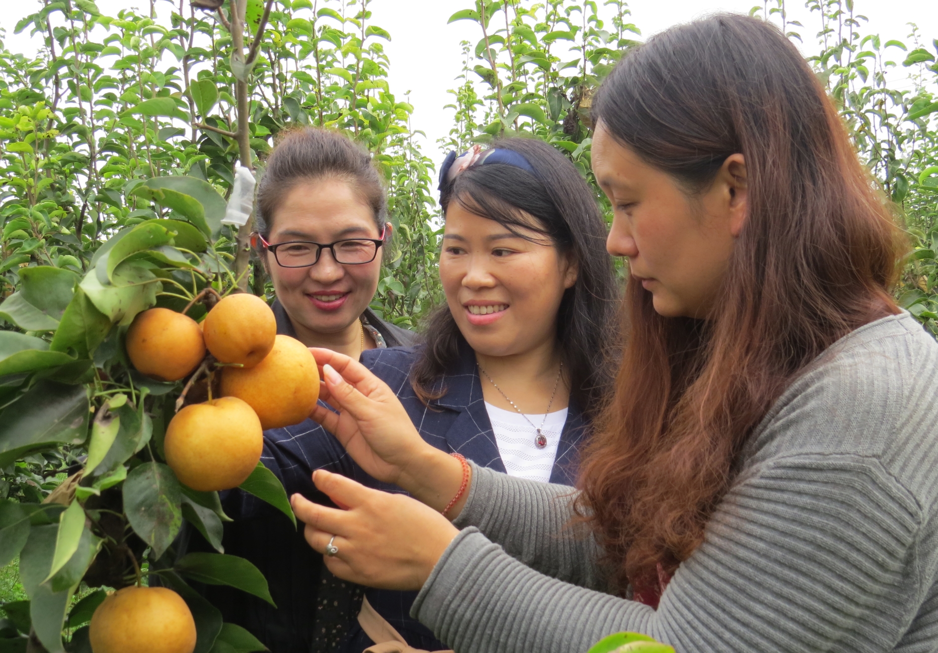 游客在邓州市金果生态农业有限公司的种植基地内采摘梨 郑雪 摄