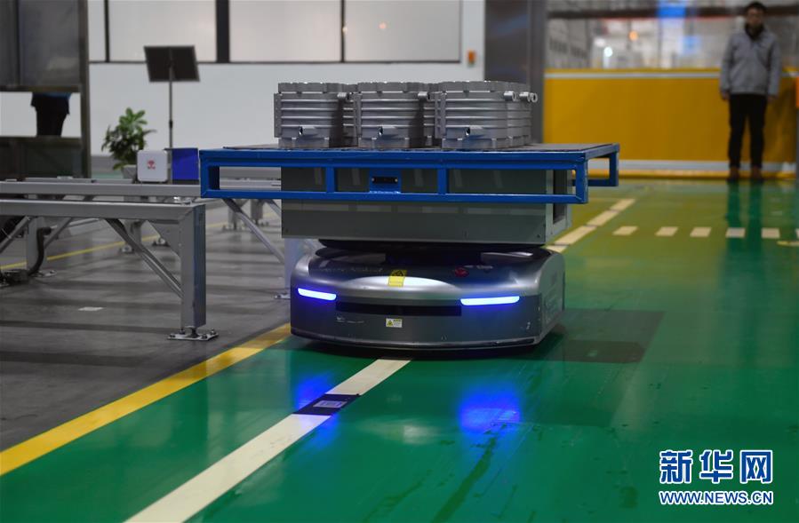 2019年2月15日,一辆智能机器人搬运车在浙江卧龙集团的自动化生产车间穿行。新华社记者 黄宗治 摄