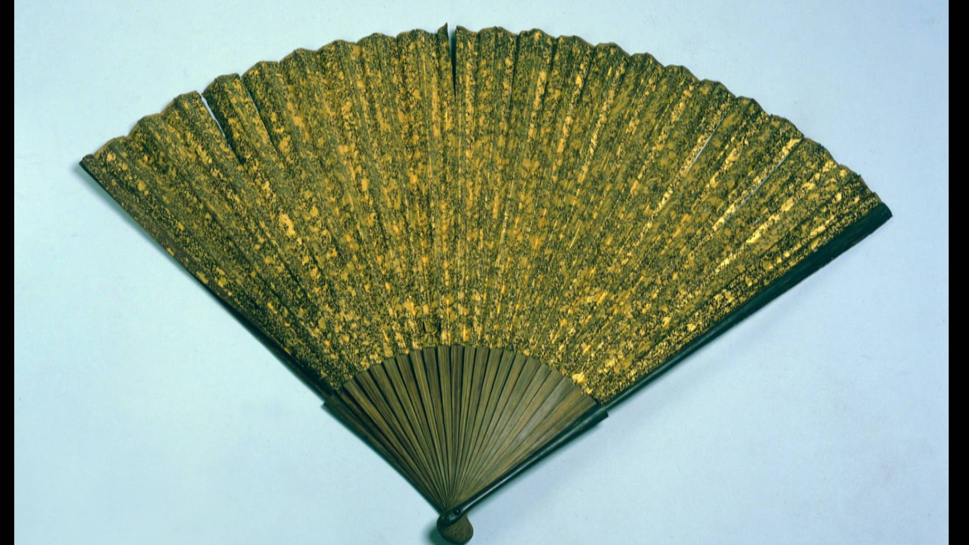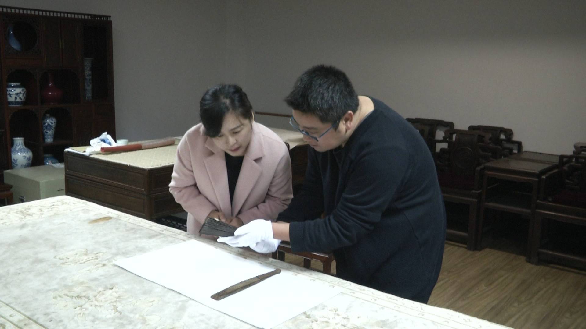 江苏扬州博物馆馆藏文物——明代洒金洒银竹骨折扇,是扬州地区出土的年代最早的折扇。它是1956年出土于扬州城北乡禅智寺附近彭淑洁墓葬,用洒金、洒银的工艺装饰扇面,体现出了使用者高贵的身份。由于年代太久远,折扇的纸质会发脆、酸化,容易折断,因此为了保护文物,在采访过程中扬州博物馆工作人员没有将折扇展开,只是通过资料图片,展现它们的精致华美。