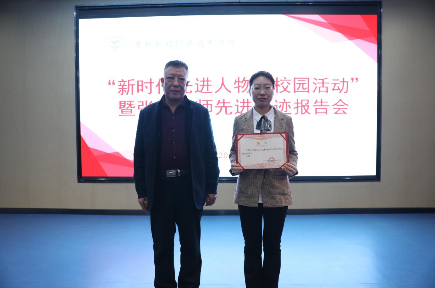报告会前,吉林科技职业技术学院常务副院长魏建明为张爽老师颁发聘书,聘请张爽老师为“校外辅导员”。