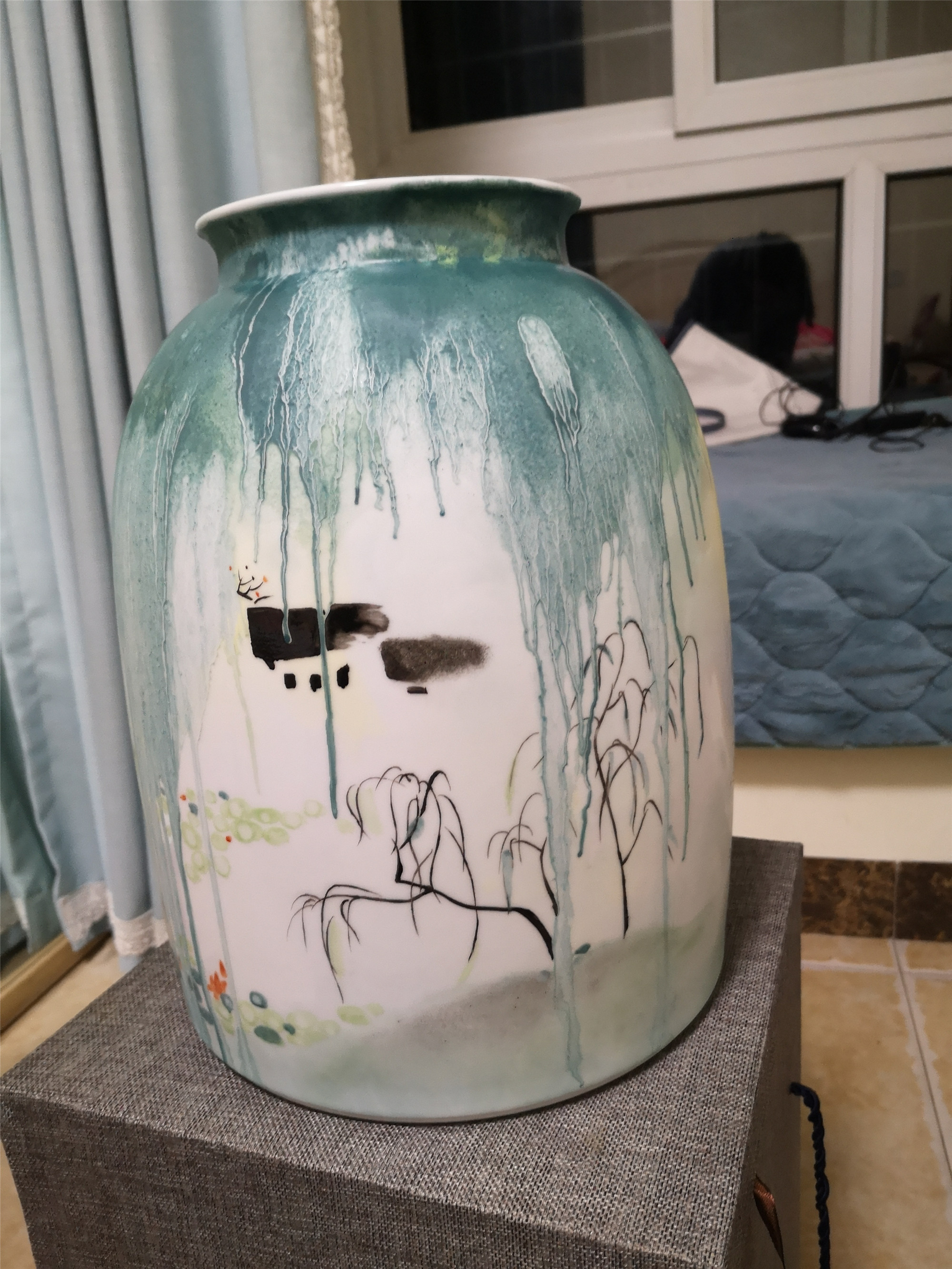 经过长期不断的探索,陈绍平的技艺不断提升,作品也越来越精美,而她尤其擅长在陶罐、陶瓷上作画。以《水墨人家》为例,陶瓷壶上绘制着天鹅水中嬉戏,睡莲花开正艳,垂柳依依,不远处还有一户人家……其作品创意新颖,设计独特,颜色素淡典雅,给人以美的享受。