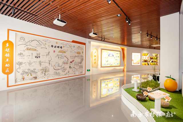 平远县脐橙省级现代农业产业园展厅是由南方报业传媒集团南方农村报规划设计与承建布展,展厅占地面积1260平方米。作为广东首家脐橙主题展馆,该展厅还被誉为“脐橙时空馆”、“平远会客厅”、“脐橙科教基地”、“橙汁科技园”。游客置身其中,可穿越500年时空,细品脐橙的前世今生,跟随脐橙的历史步伐,周游世界,最后回归故里发展壮大。