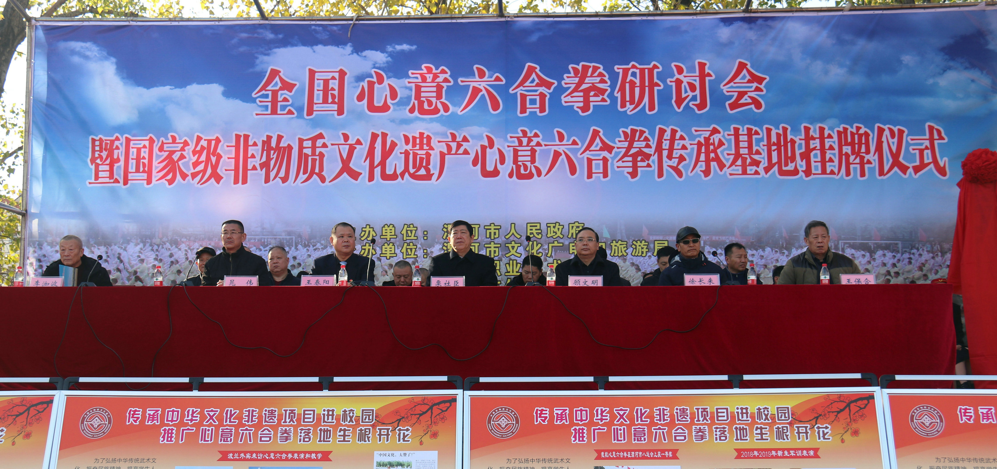 2019年12月26日,2019年全国“心意六合拳”研讨会暨国家级非物质文化遗产心意六合拳传承基地挂牌仪式在河南漯河职业技术学院隆重举行,国家级非物质文化遗产心意六合拳传承基地在该校正式挂牌。来自全国各地的30多位武术大家、知名心意六合拳传承人和全校师生共2500多人参加本次活动。