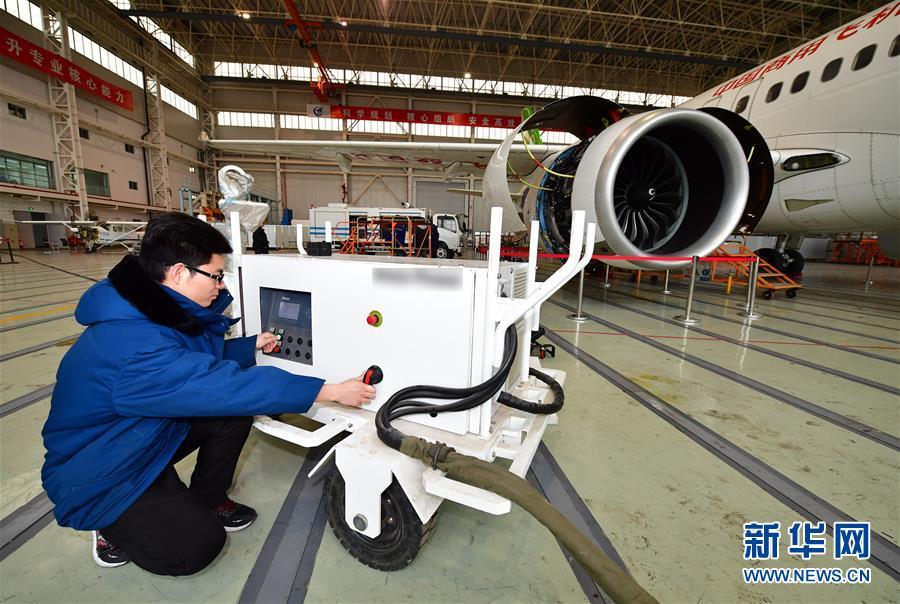 中国飞行试验研究院C919试飞团队特设员李凡在机库内进行C919客机101架机的通电工作(1月30日摄)。 新华社记者 邵瑞 摄