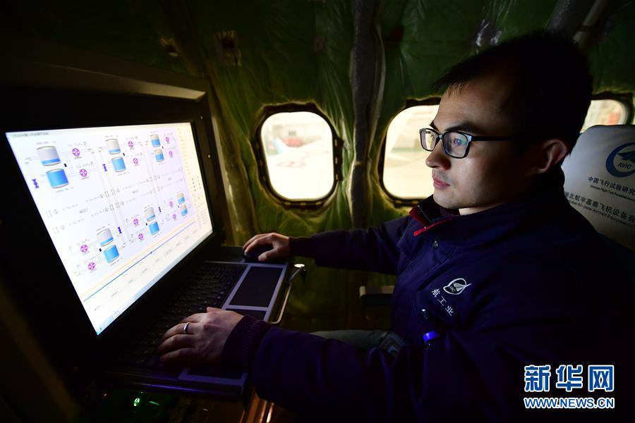 中国飞行试验研究院C919试飞团队设计改装人员颜凯在C919客机101架机客舱内的设备屏幕前操作飞机纵向重心自动调节系统(1月30日摄)。 新华社记者 邵瑞 摄