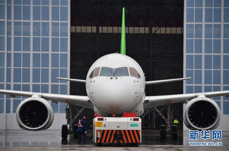 这是驶出中国飞行试验研究院机库的C919客机101架机(1月31日摄)。 新华社记者 邵瑞 摄