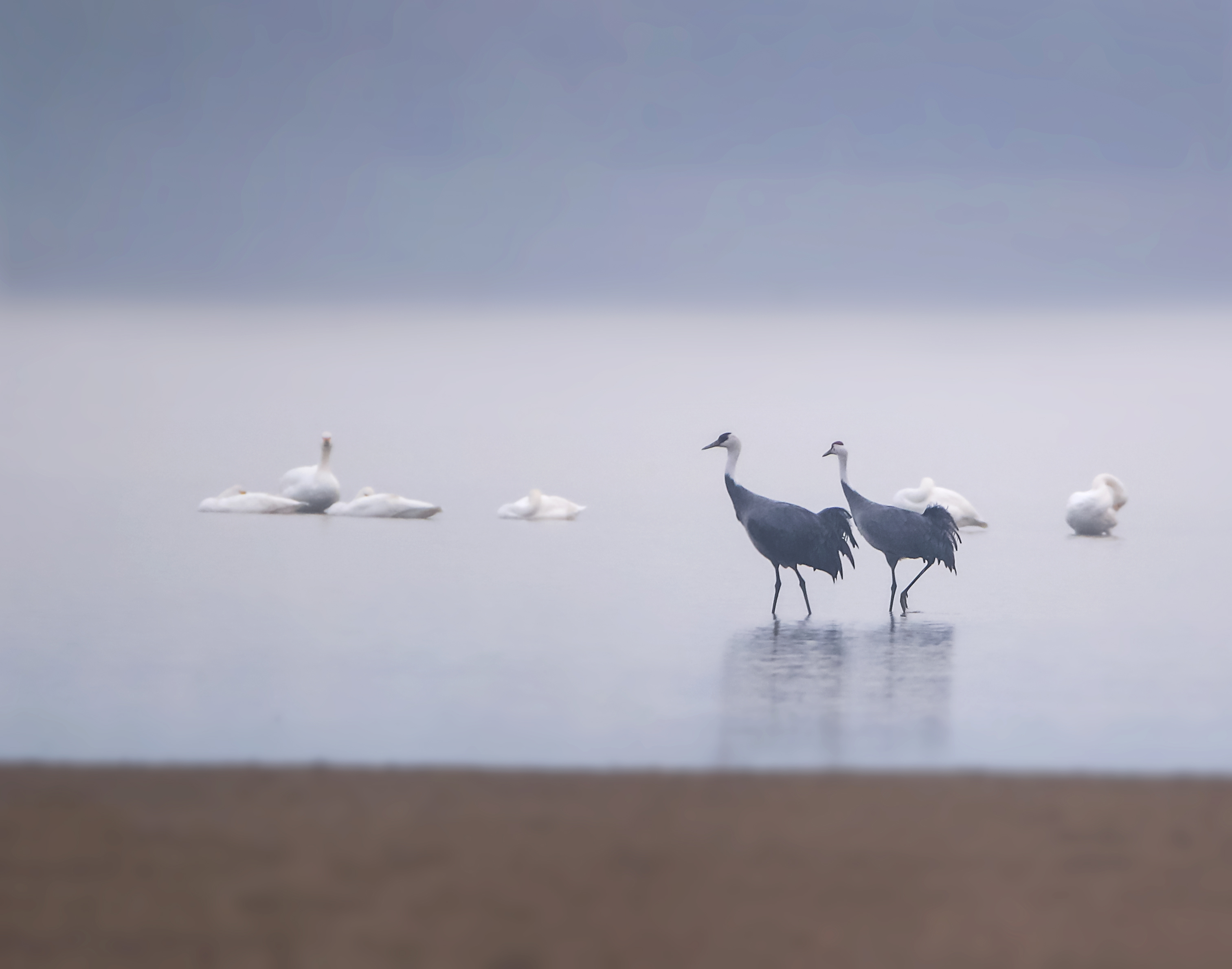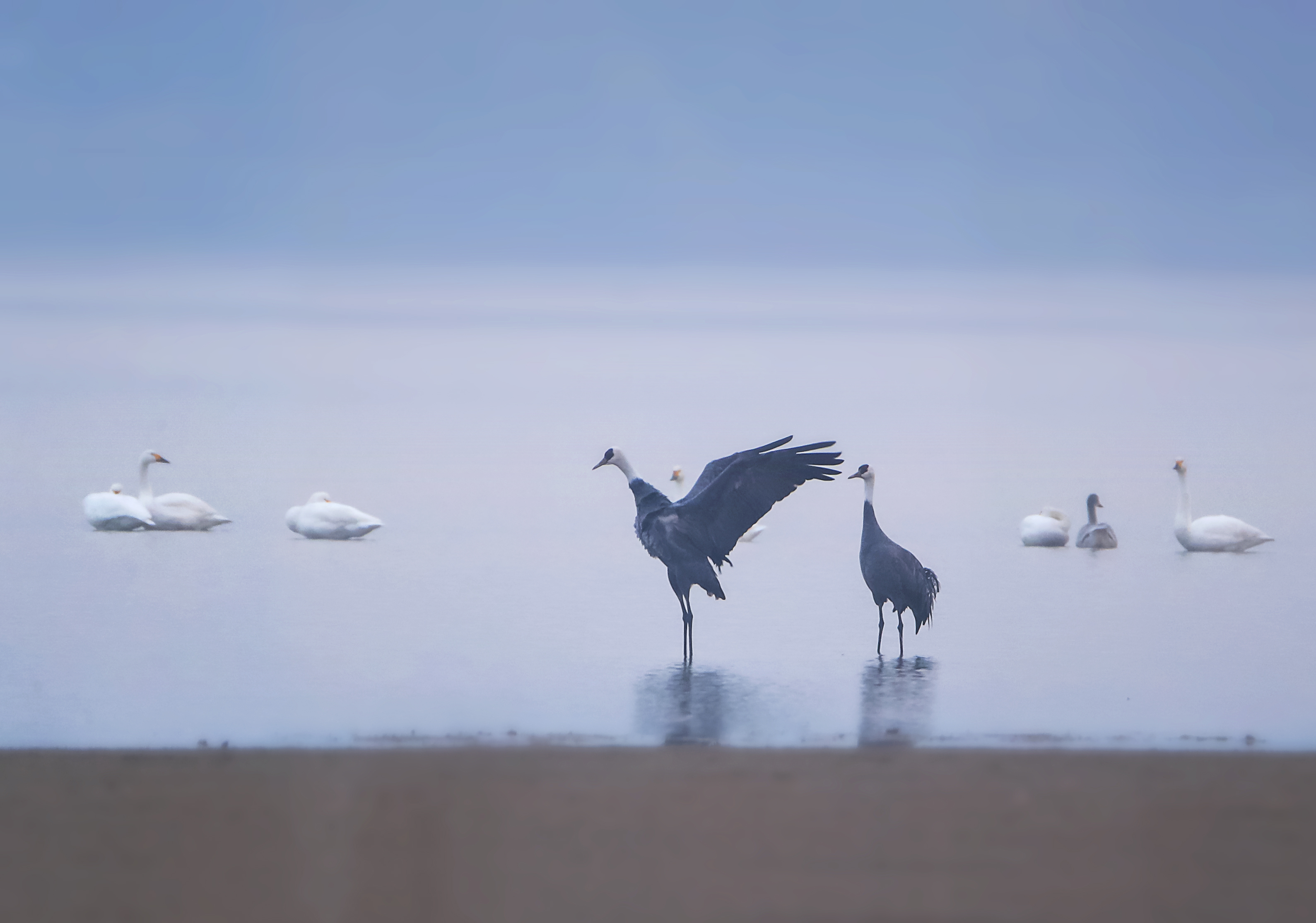 孙葆根是一名拍鸟爱好者,2019年11月17日7时,他带上摄影设备前往安徽庐阳董铺国家湿地公园拍摄迁徙的候鸟。两只漫步在滩涂中的“大鸟”引起他的注意。这两只鸟灰衣素裳,头颈雪白,眼睛前面和额部还长有黑色的羽毛,孙葆根误以为是丹顶鹤,连忙按下了快门,一连拍摄了数十张。